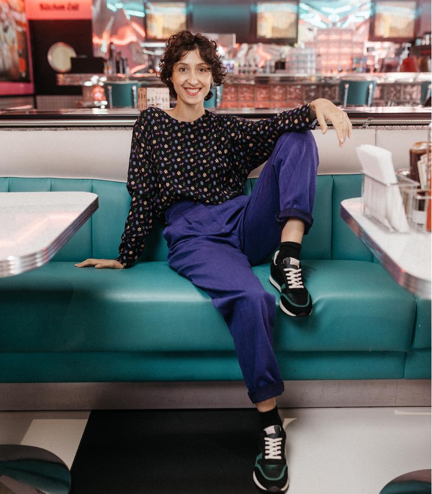 Paulette est un de nos tous premiers patrons, Paulette est un top ample à encolure ronde avec une fente milieu dos fermée par un bouton. Des plis sur les épaules apportent une allure structurée à ce top fluide. Nous vous proposons de coudre Paulette dans notre viscose soyeuse Confetti, une viscose Ecovero noire parsemée de motifs géométriques multicolores.