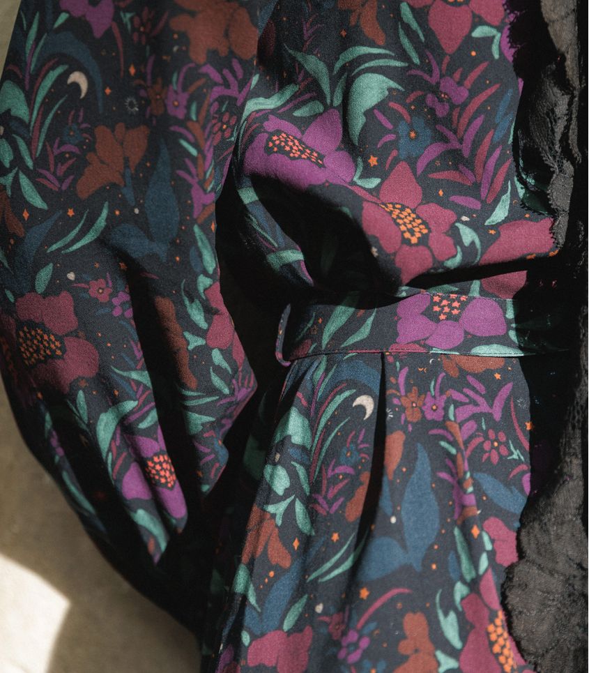 Le tissu choisi pour cette robe est la star de la saison, notre imprimé Oracle issu de notre collection les Divines.