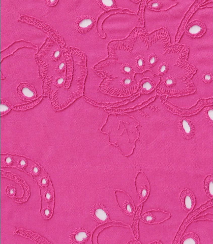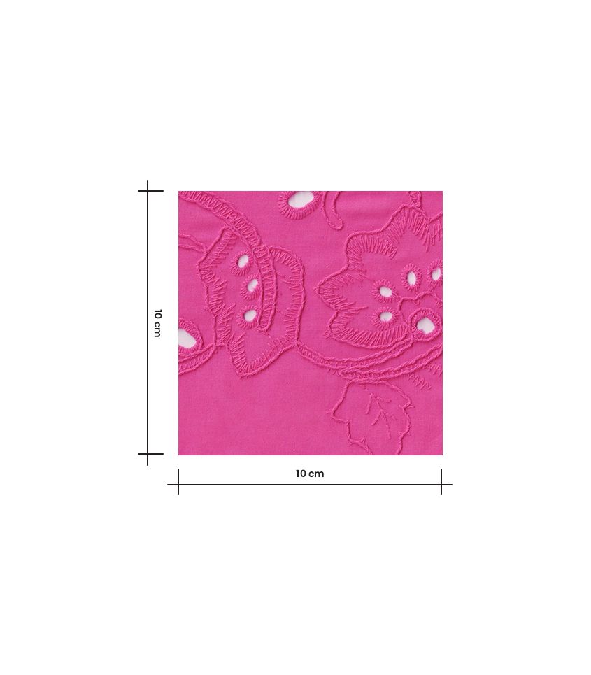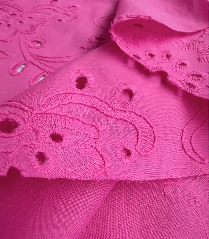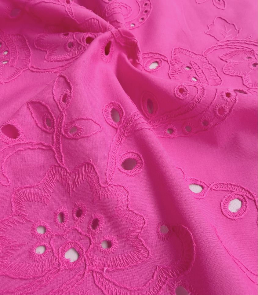 Broderie anglaise rose fuchsia aux motifs fleuri brodés. Tissu légèrement ajourés, brodé sur une fine base de coton. Élégance et légèreté, alliance idéale pour l'été.