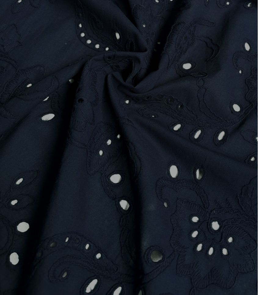 Broderie anglaise bleu marine aux motifs fleuri brodés. Tissu légèrement ajourés, brodé sur une fine base de coton. Élégance et légèreté, alliance idéale pour l'été.