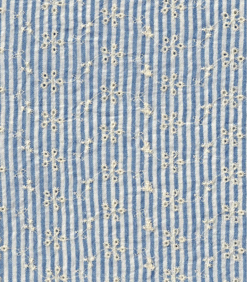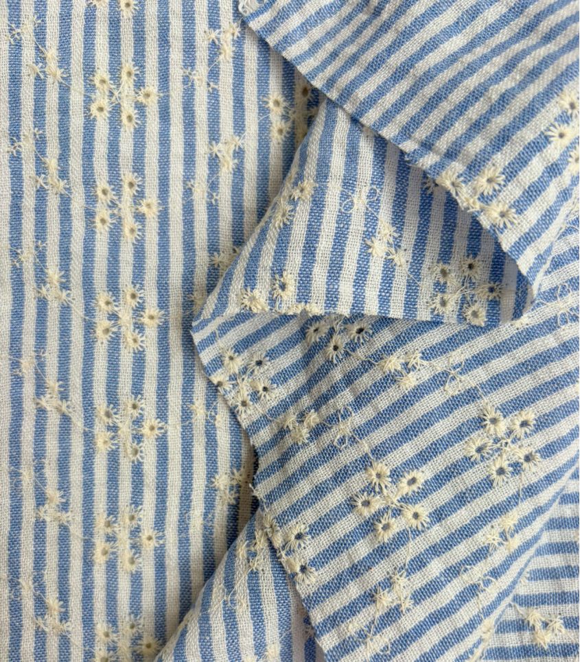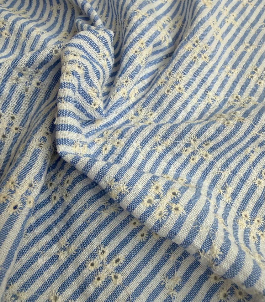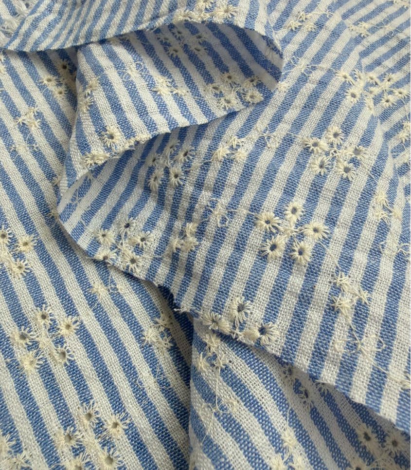 Tissu en pur coton rayé bleu ciel et blanc brodé de petite fleurettes dont le coeur est délicatement ajouré. Tissu original proposant une association rayure et broderie anglaise.