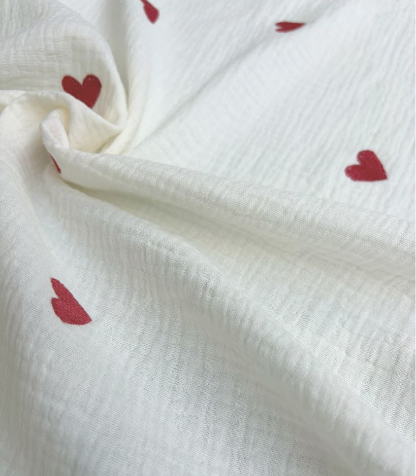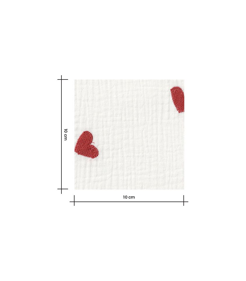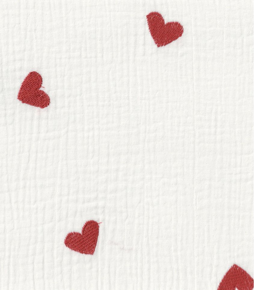 Gaze de coton écrue brodée de petits cœurs rouges. La gaze de coton est un tissu léger, caractérisée par un tissage de fil de coton assez écarté. Elle est souvent employée pour des vêtements d’enfants car d'une grande douceur. Aspect légèrement froissé.