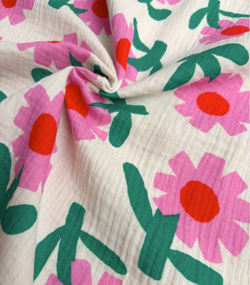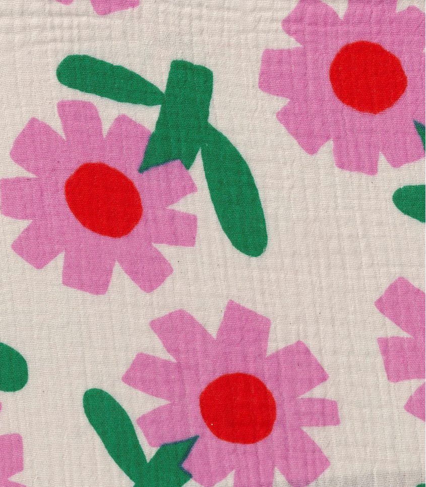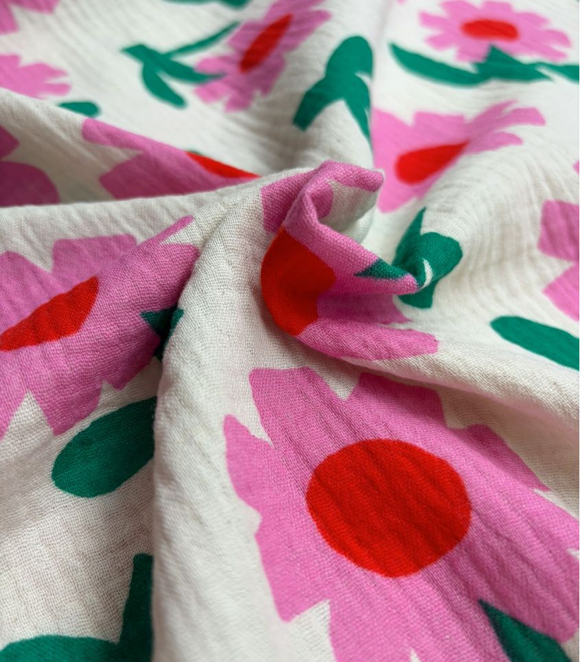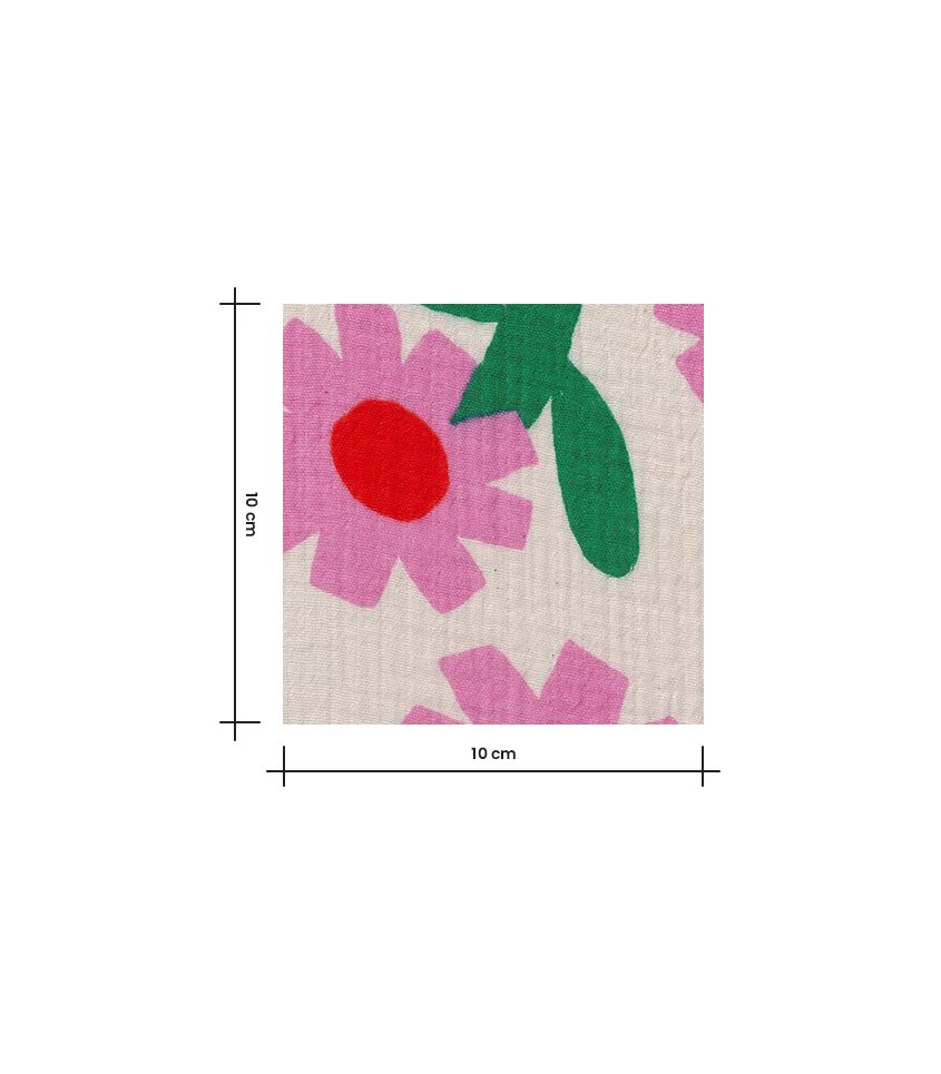 Gaze de coton écru imprimée de fleurs pop roses au coeur rouge. Le tissage gaze de coton est léger et aérien, caractérisée par un tissage de fil de coton assez écarté et donne un aspect légèrement froissé.