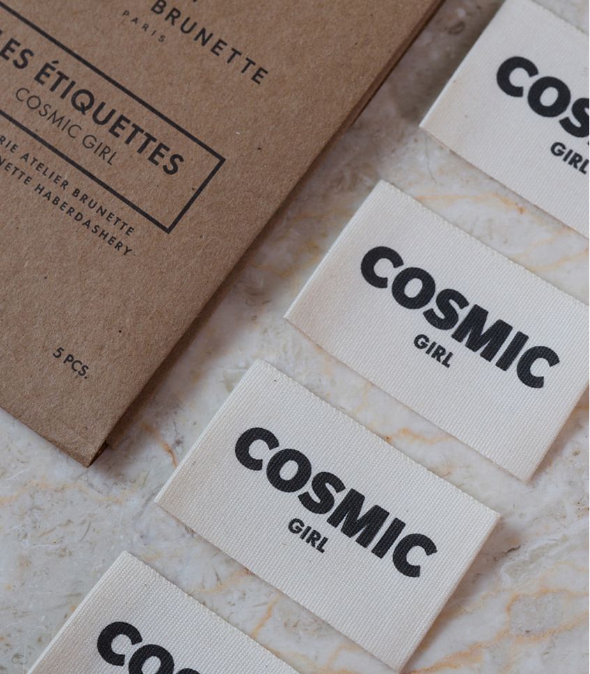 Lot de 5 étiquettes Atelier Brunette en coton écru imprimé "Cosmic Girl". Des petits bijoux à coudre avec amour sur toutes les pièces de votre garde-robe.