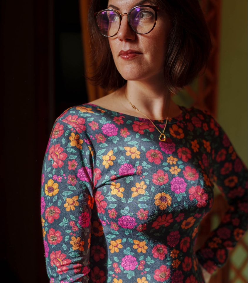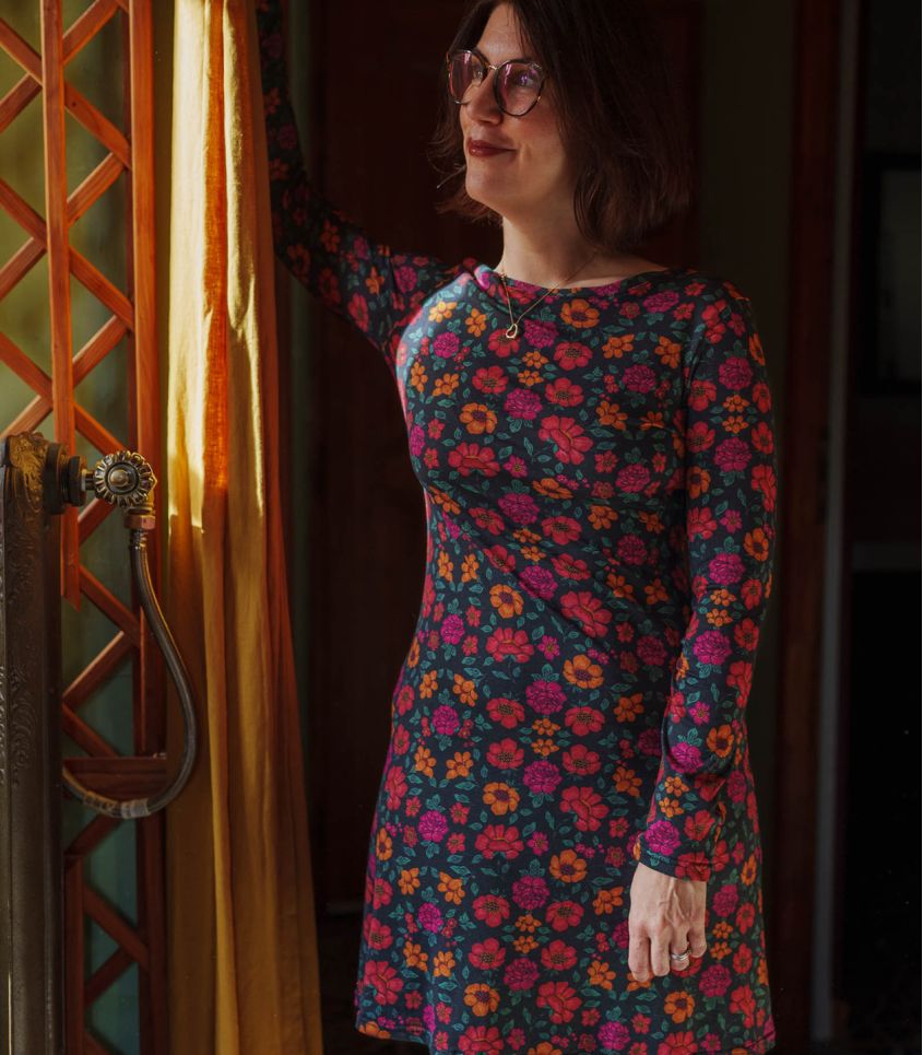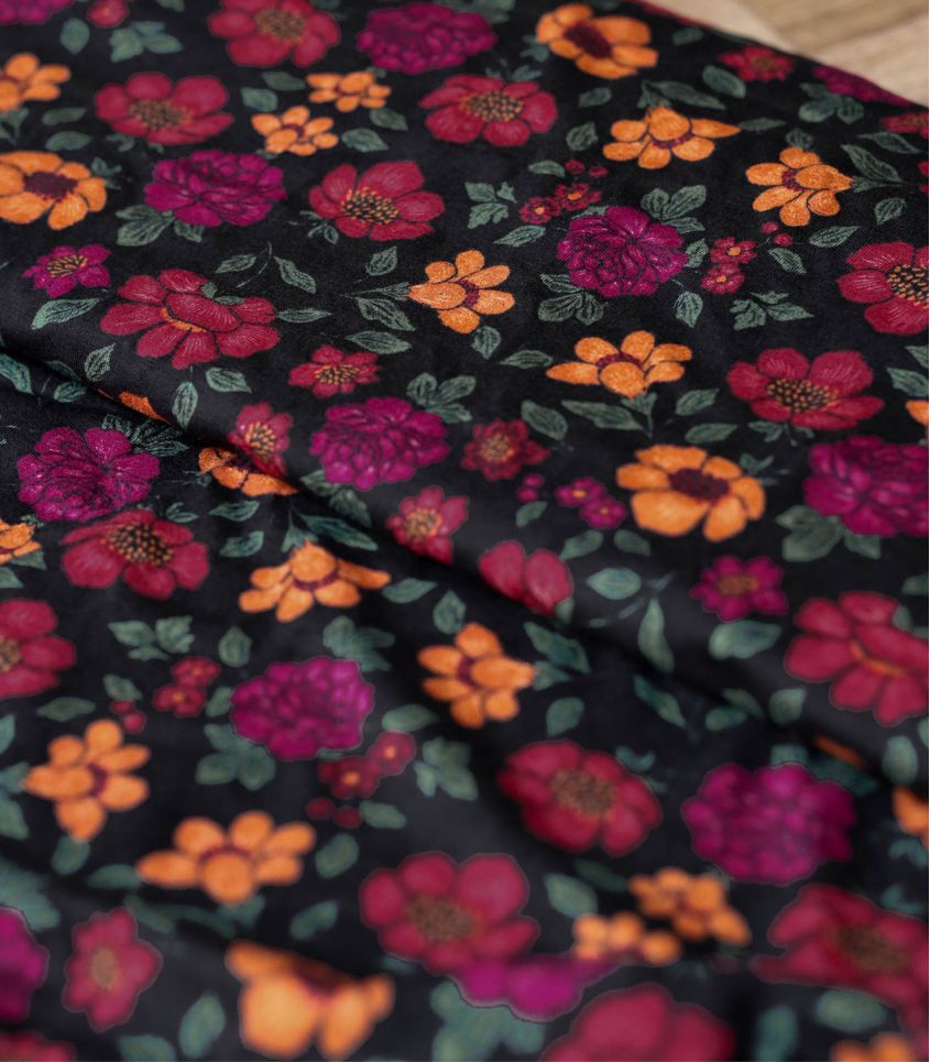 Jersey imprimé Lise Tailor. Dalia – Un motif floral généreux où s’épanouissent de grandes fleurs aux couleurs vives. Il évoque les tables dressées au jardin, les bouquets improvisés et la joie simple des retrouvailles printanières.