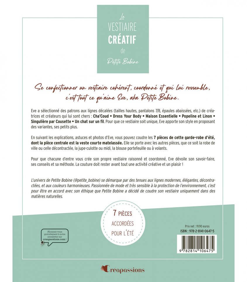 Un livre carte blanche à Eve Koch alias Petite Bobine qui a sélectionné les patrons de créatrices, qu’elle personnalise pour vous proposer 5 tenues à coudre tout en vous suggérant comme associer tissus/patrons/couleurs pour se créer un vestiaire personnalisé et raisonné, composé de pièces qui s’accordent entre elles.