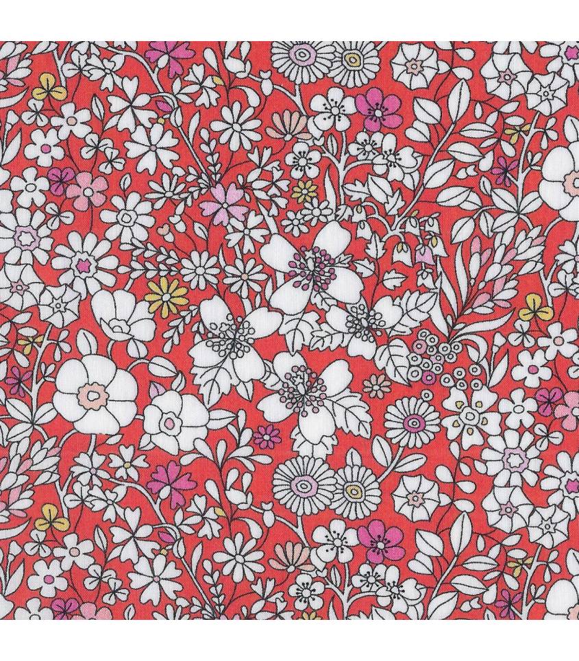 Tissu Liberty June's meadow vermillon. Fleurs blanches avec des touches de couleurs sur fond rouge orangé. Qualité Tana Lawn.