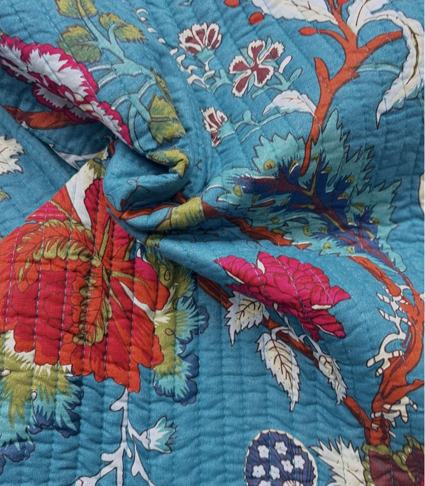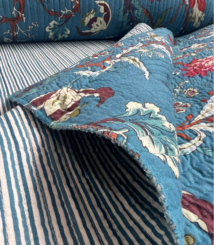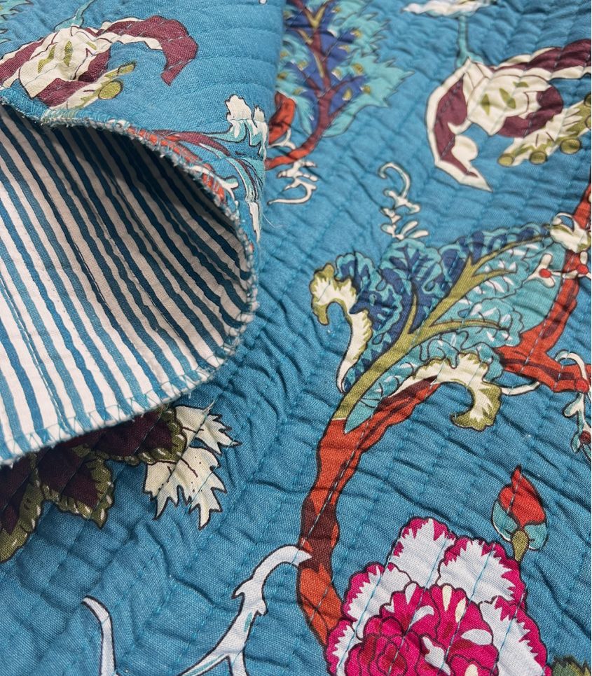 Tissu matelassé double face, un coté imprimé block print floral rose sur fond bleu canard, l'autre rayé du même bleu. Tissu idéal pour la réalisation d'accessoires, déco ou vêtements (veste ou gilet pas exemple).
