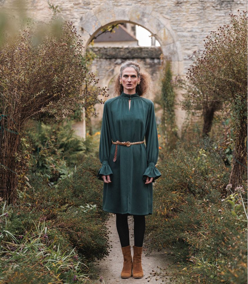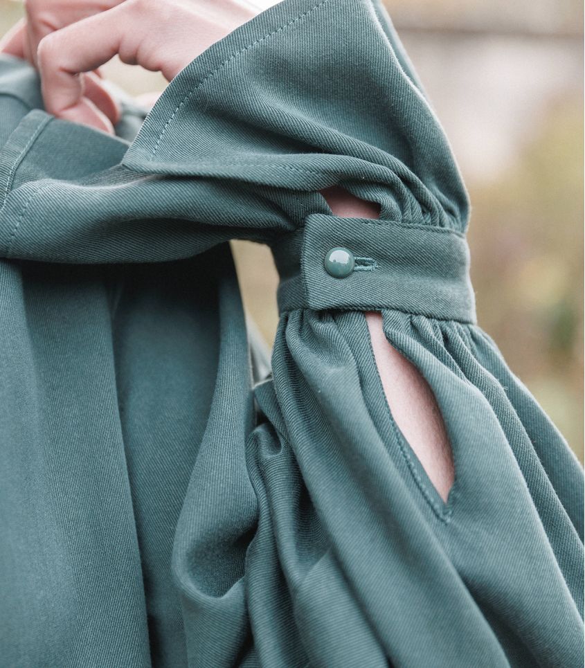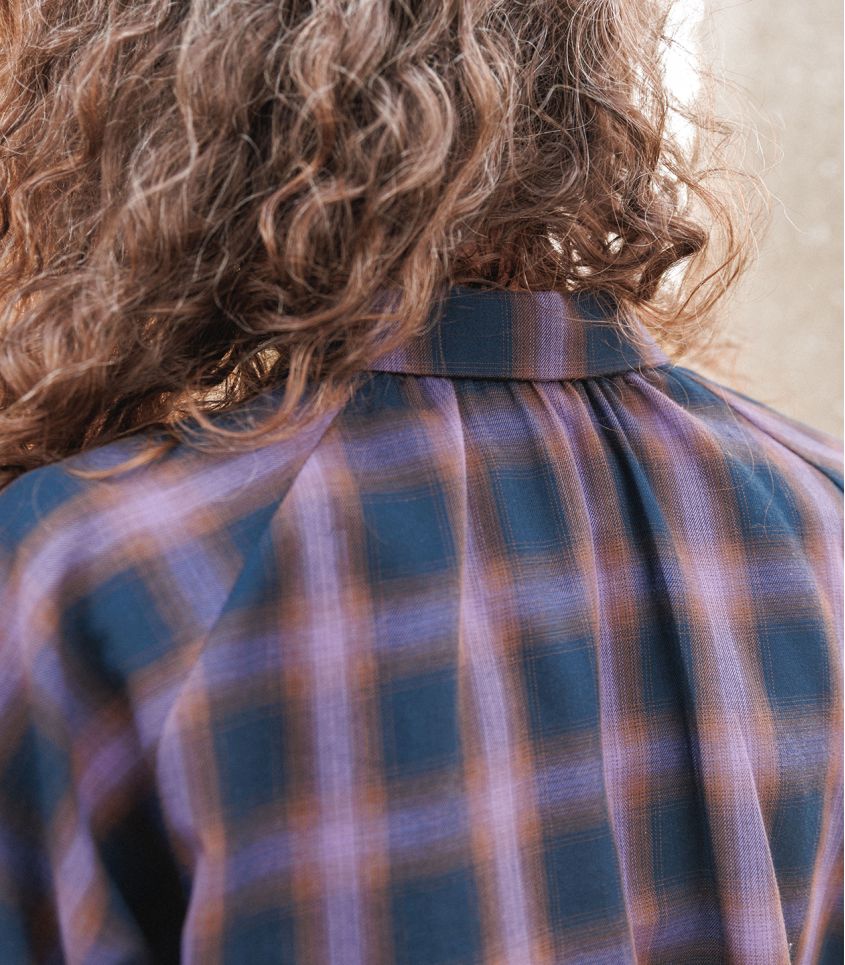 VIOLETTE est un chemisier ou une robe au charme raffiné, reconnaissable à ses manches raglan et aux fronces délicates qui soulignent l’encolure, à l’avant comme à l’arrière.