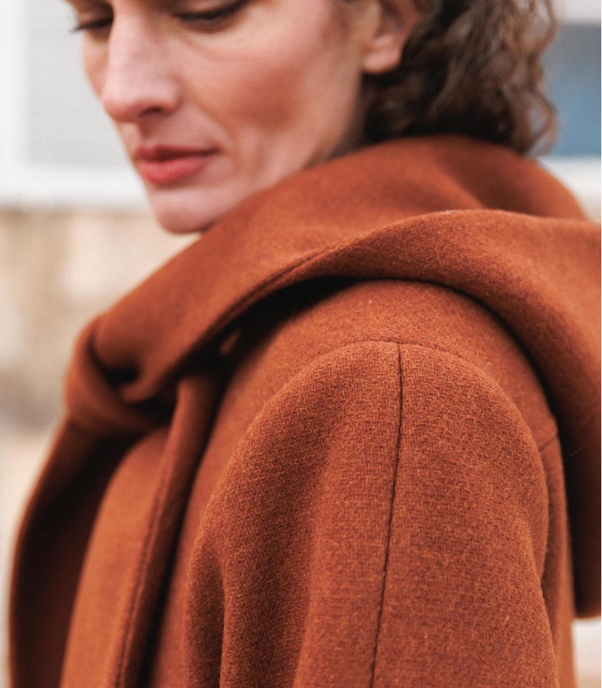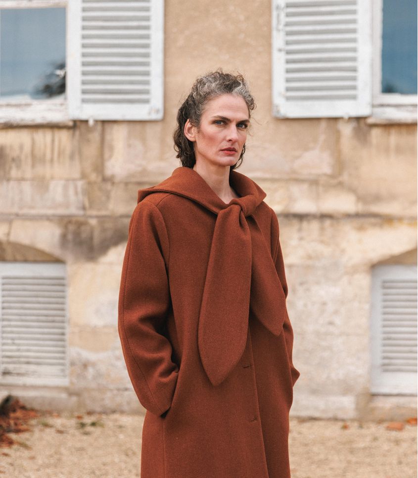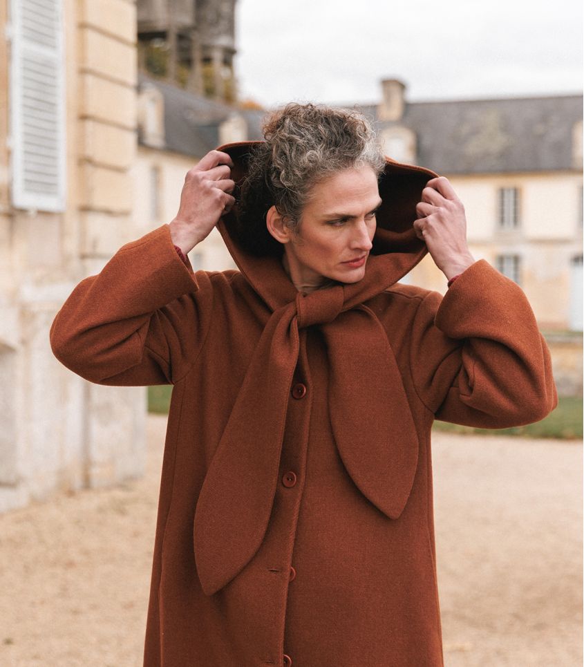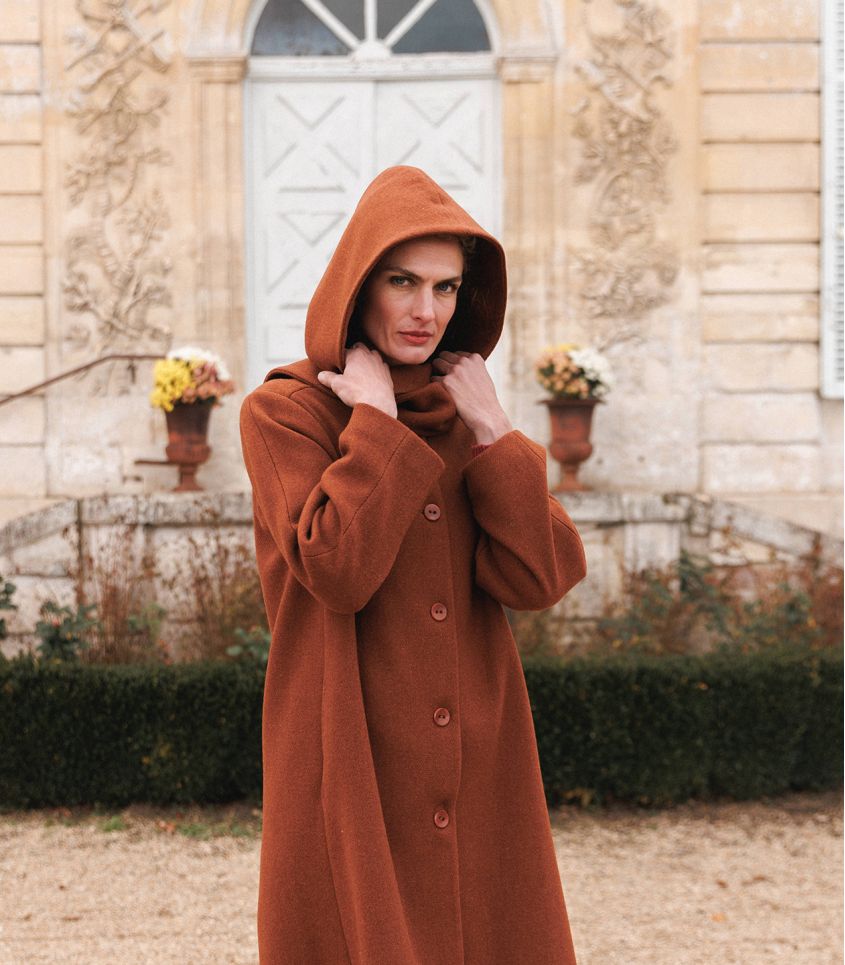 Ici Fabulette est présentée avec le manteau Frisquette que nous avons cousu en drap de laine manteau.