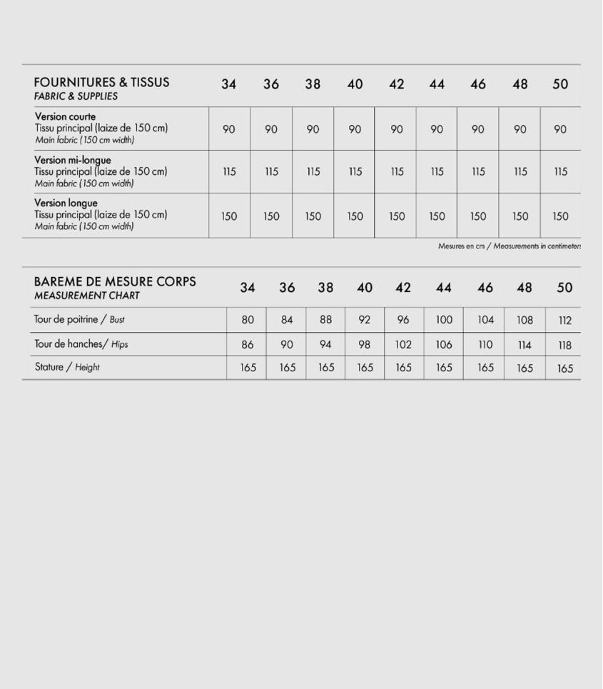 TABLEAU DE MESURES ET QUANTITÉS TISSUS DANS LES IMAGES DE LA FICHE PRODUIT.