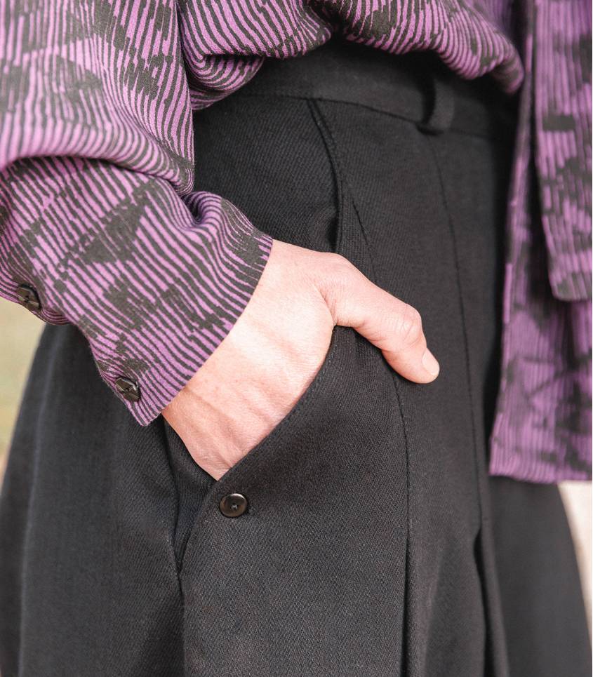 Les poches obliques s’intègrent avec finesse dans la ligne du premier pli et se terminent par un arrondi adouci, souligné d’une surpiqûre ou d’un bouton décoratif.