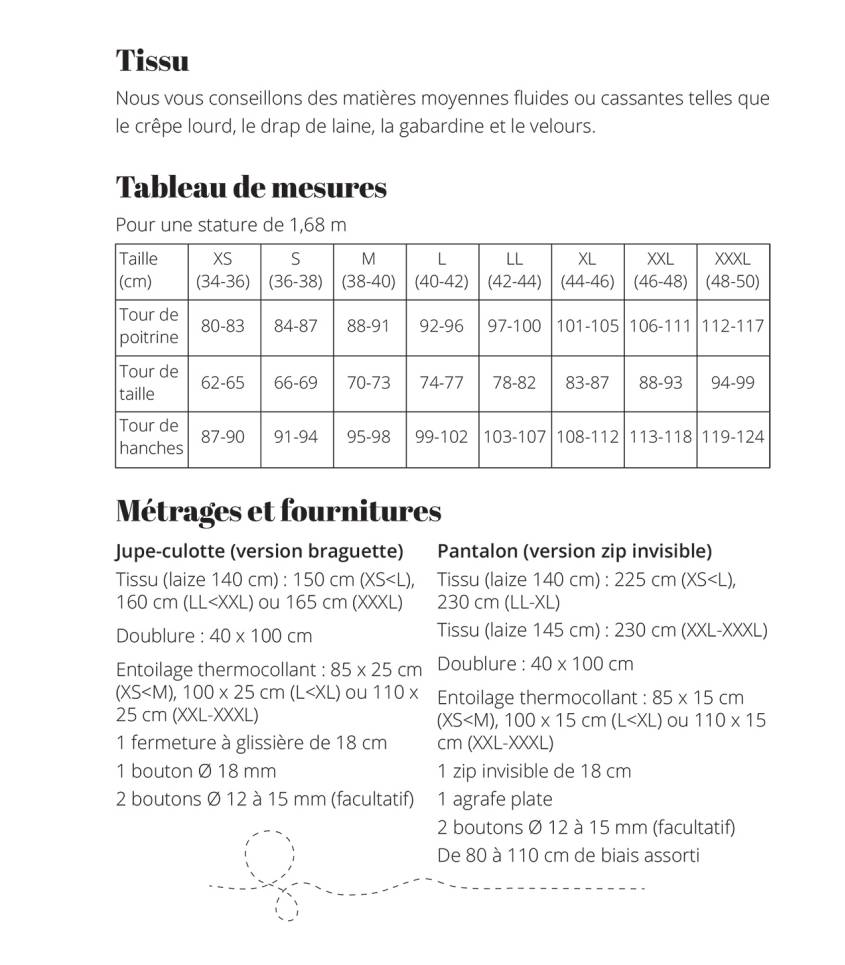 Tissu (laize 140 cm) : 225 cm (XS<L), 230 cm (LL-XL)
