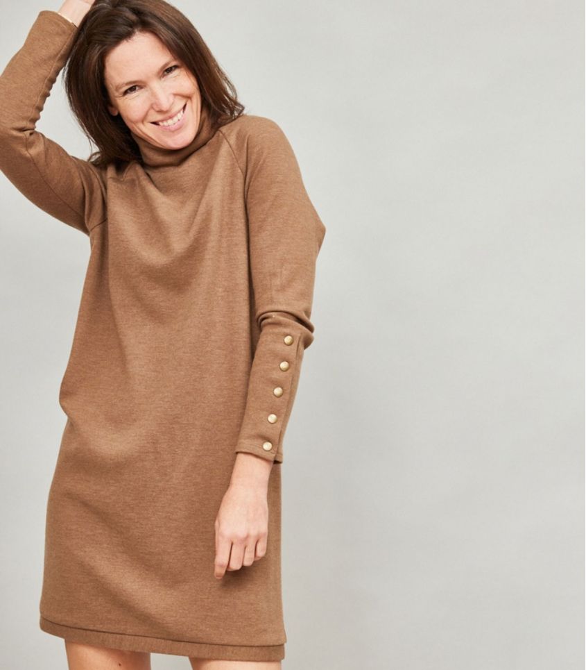 Patron robe Capsule par Atelier Scammït. Capsule est une robe-pull qui présente me combo parfait entre confort et féminité ! Elle deviendra incontournable tantôt pour les journées froides grâce à son col roulé ou cheminée, tantôt pour vos soirées chics avec son encolure ronde dégagée option dos nu.