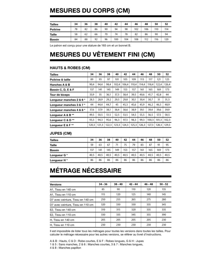 Le tableau de mesures, métrage nécessaire et toutes les versions sont présentées avec les photos du patrons.