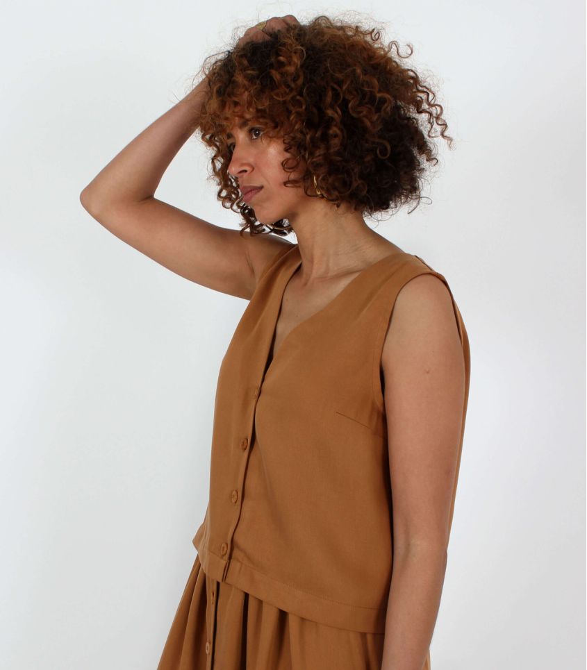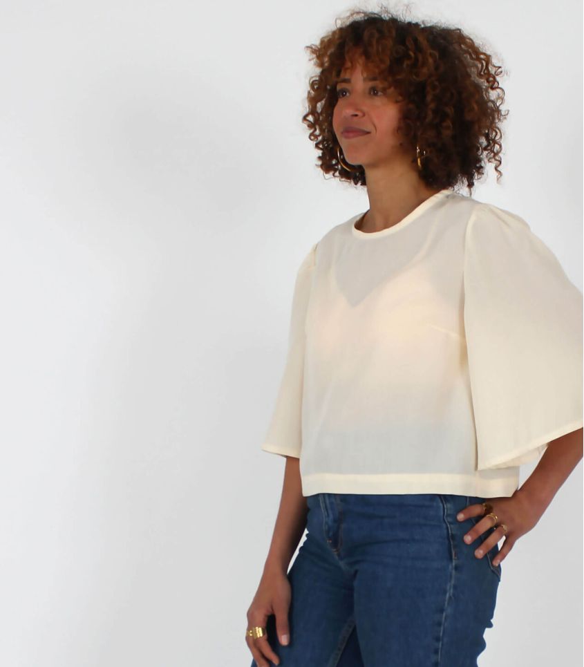 Le haut Lotus se distingue par sa coupe structurée, soulignée d’une pince poitrine latérale. Il peut être réalisé avec une encolure ronde ou en V, pour s’adapter à tous les styles.