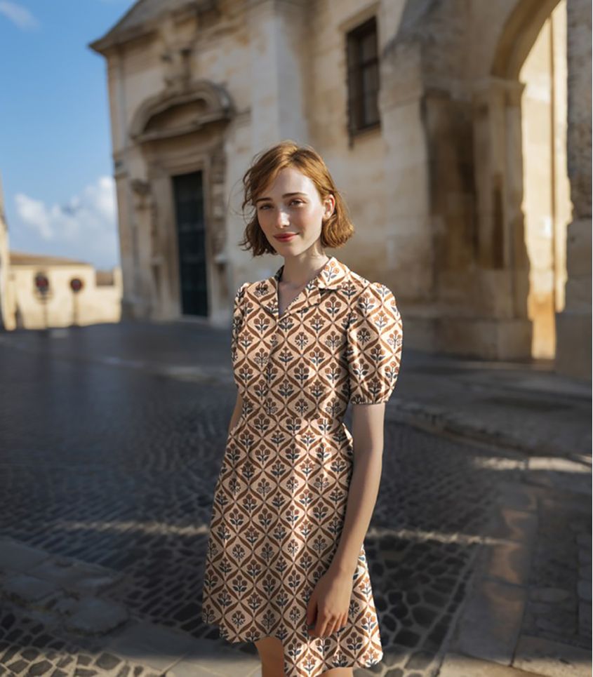 Son fond beige camel est parsemé de petits bouquets stylisés, pour un rendu graphique et poétique à la fois.