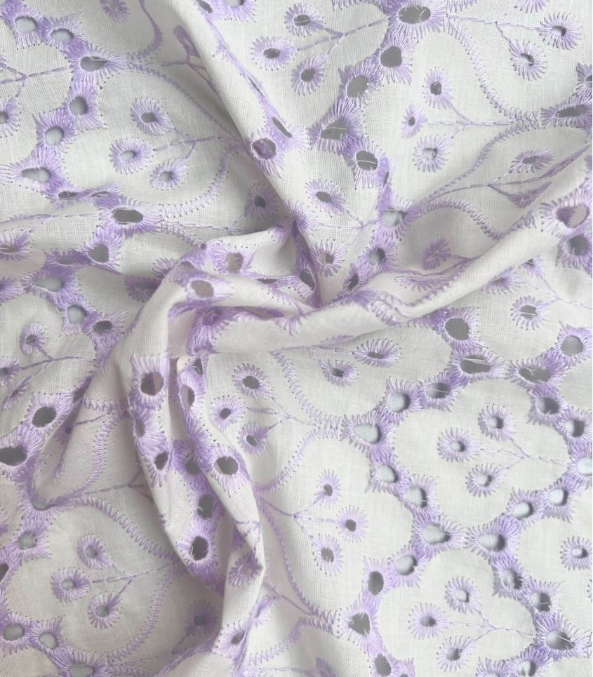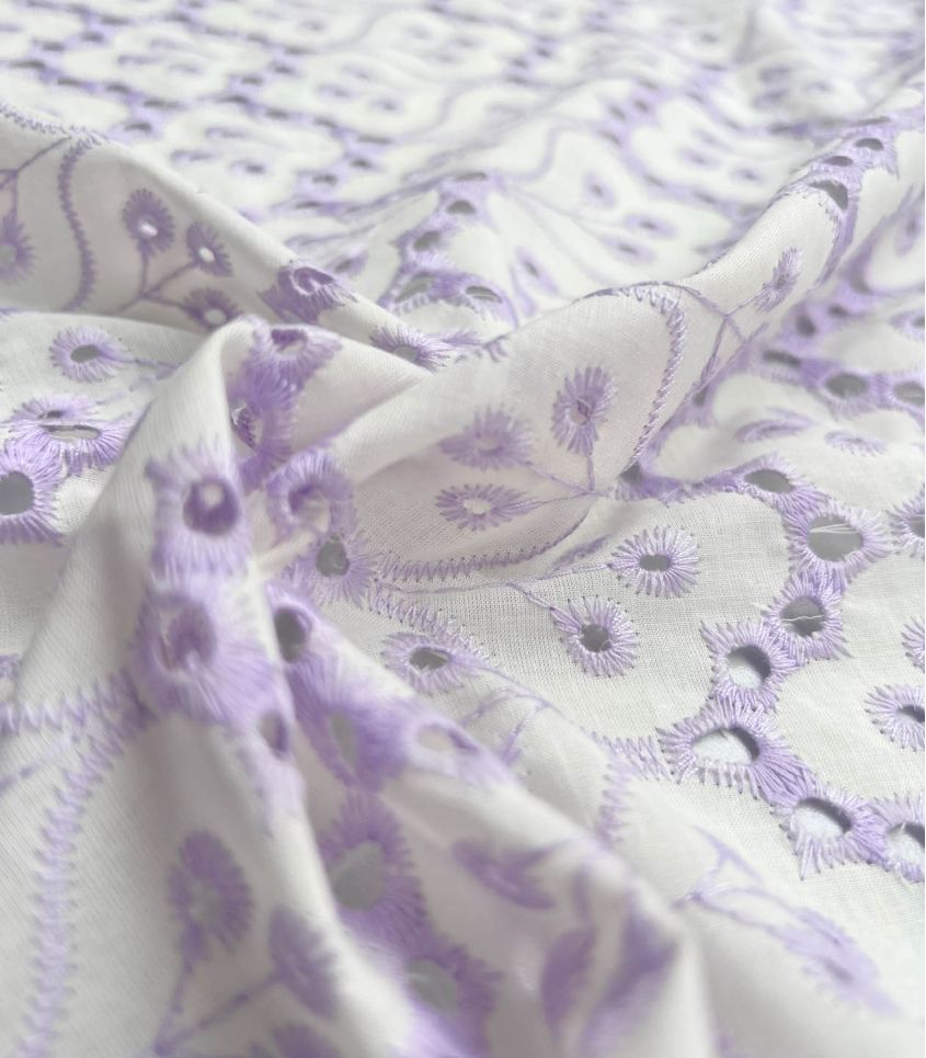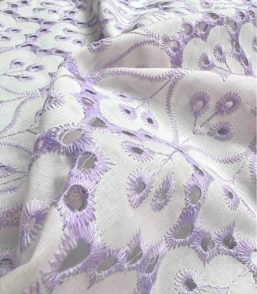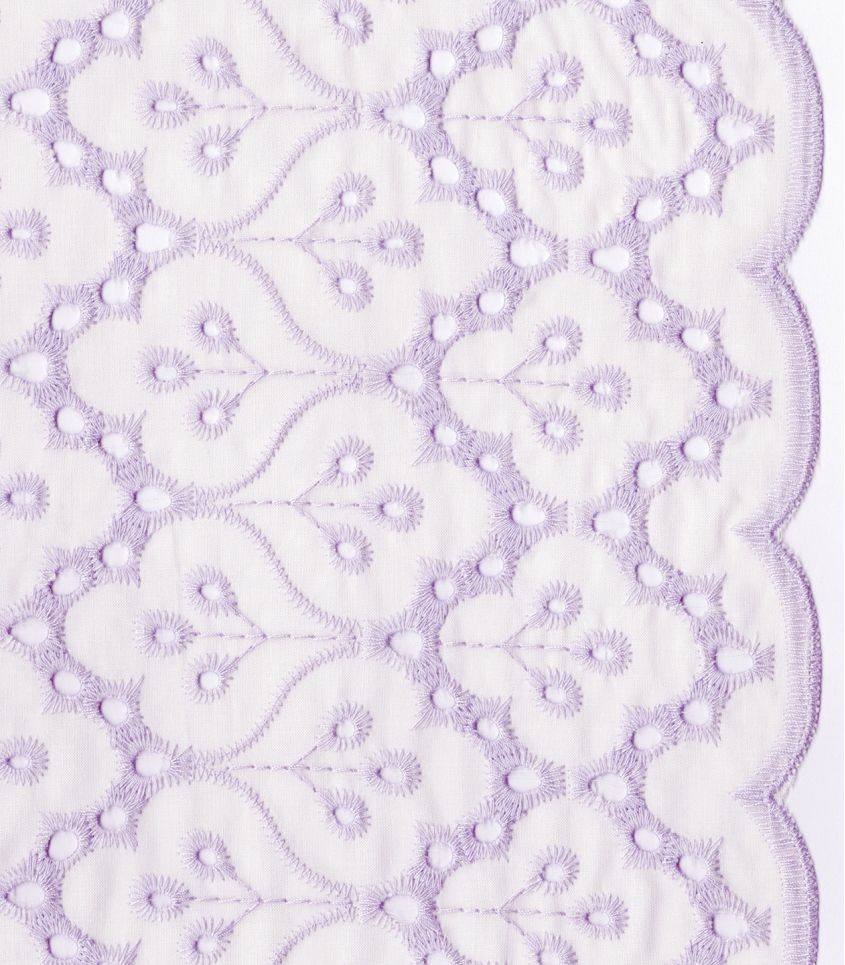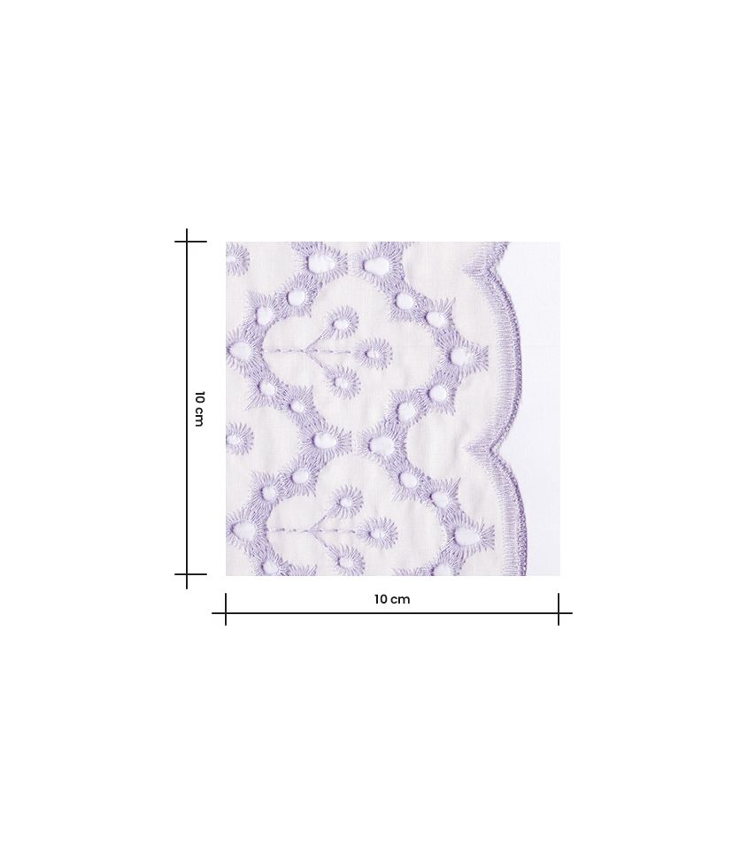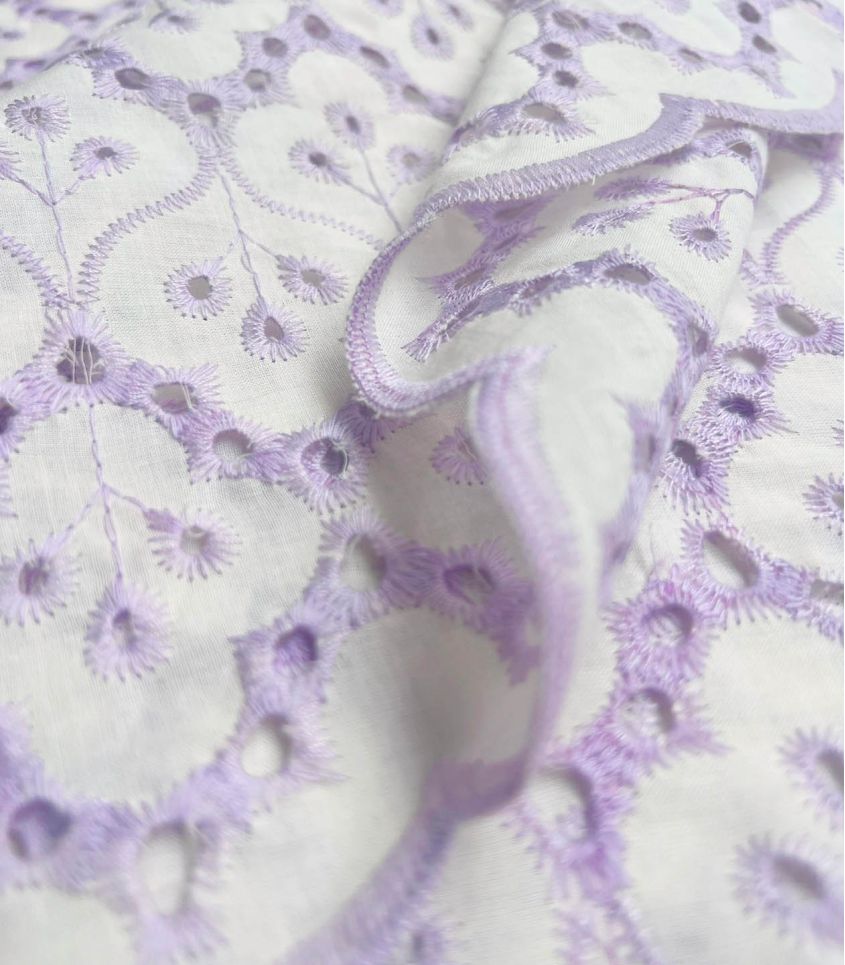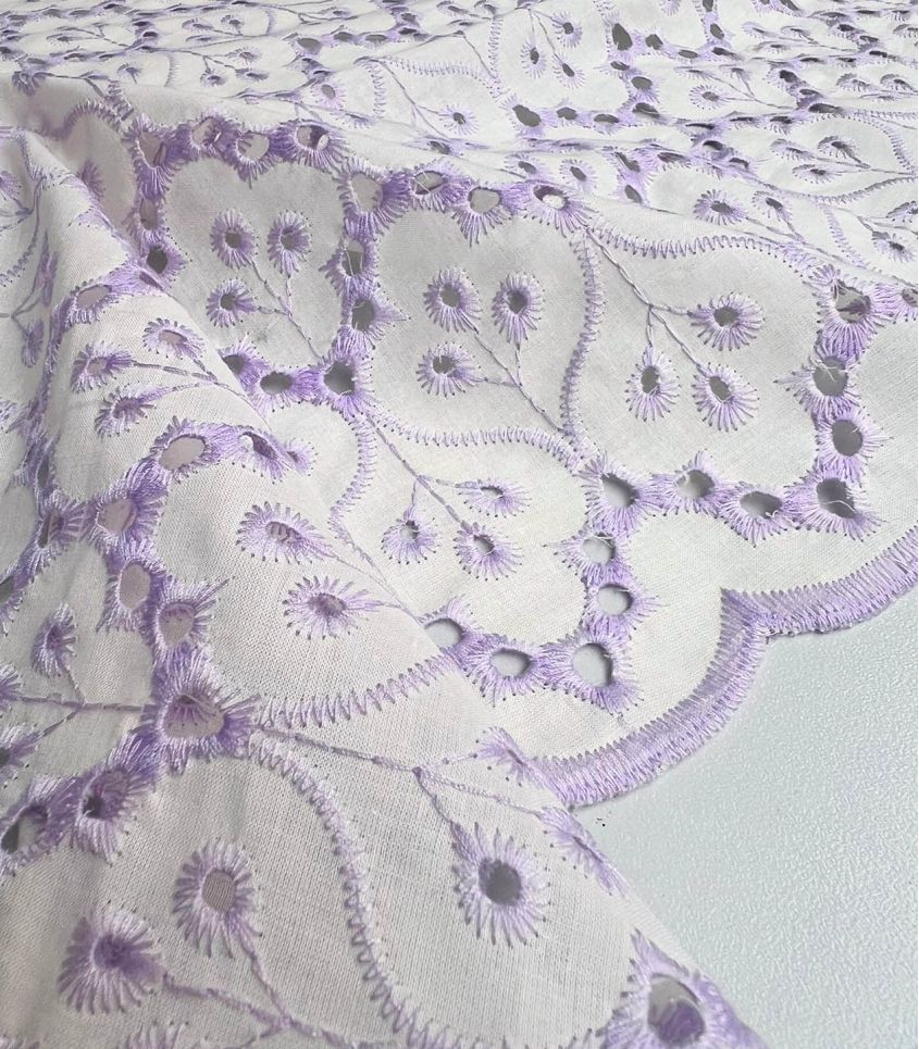 Tissu coton brodé double feston. Cette très belle broderie anglaise est brodée en bleu lilas sur fond blanc. Tissu légèrement transparent, prévoir une doublure selon les utilisations.