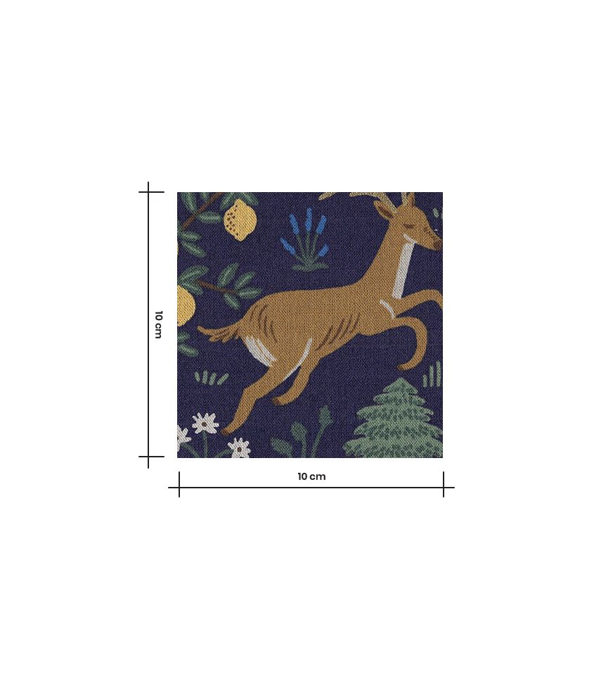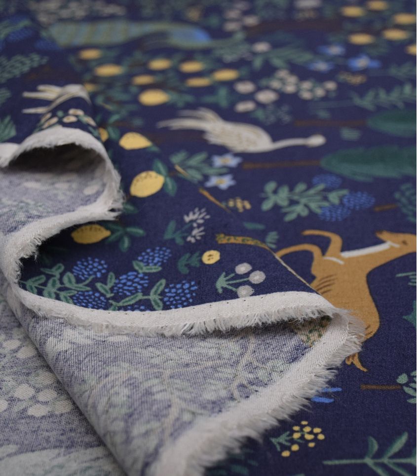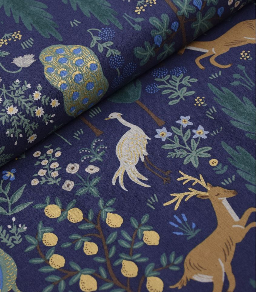 Tissu Cotton & Steel. Canvas coton/lin, idéal pour la déco et accessoires déco : coussins, rideaux etc ! Imprimé Menagerie , coloris Navy (bleu foncé) avec quelques touches discrète de doré légèrement scintillant. Design Rifle paper co - Collection Camont.