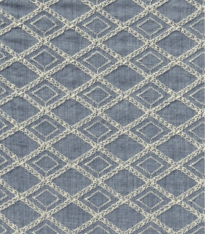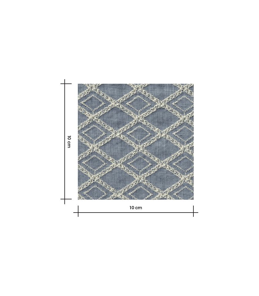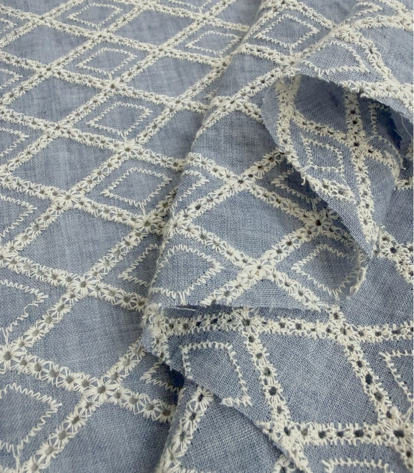 Tissu en chambray de coton bleu brodé de losanges écrus. Élégance et légèreté, alliance idéale pour le printemps. Tissu légèrement transparent, prévoir une doublure selon les utilisations.