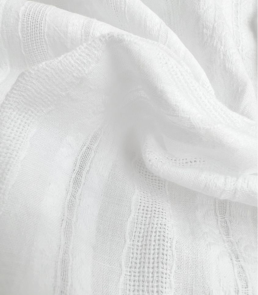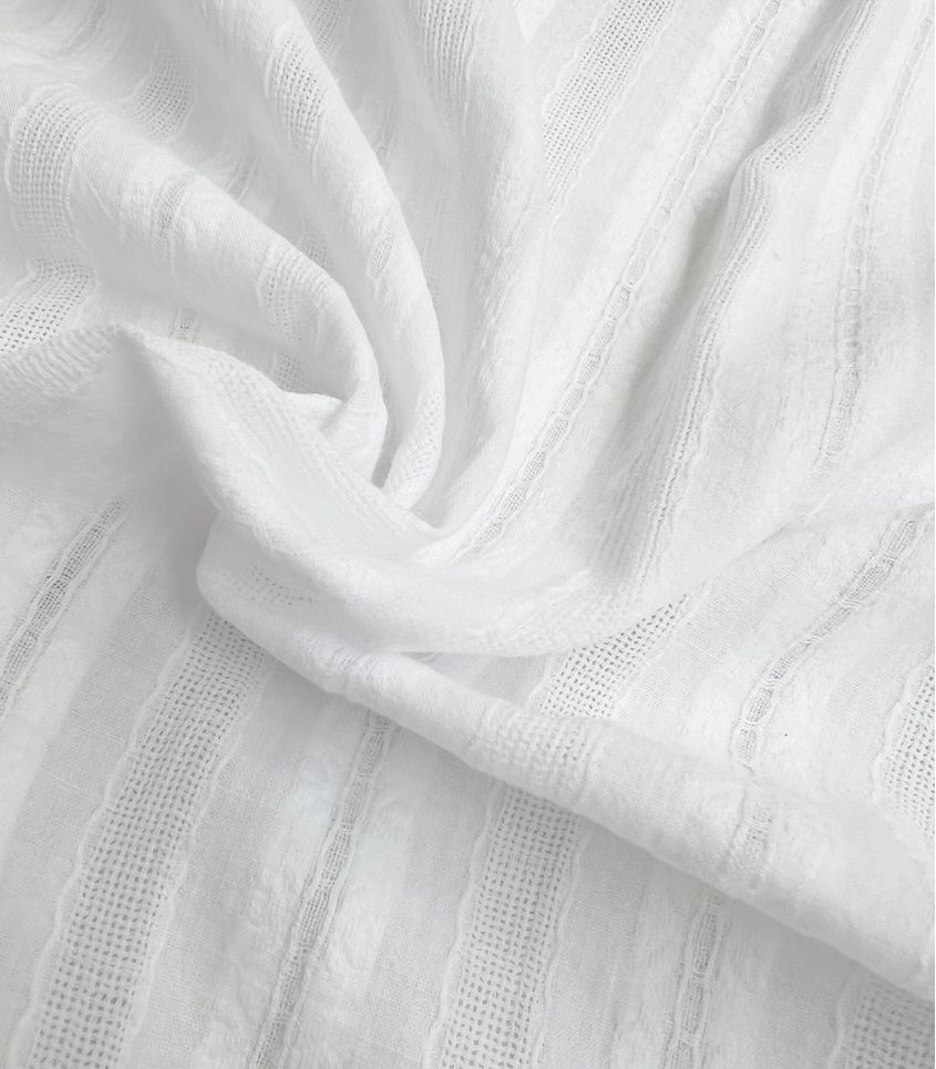 Coton brodé d'une rayure torsadée brodée. Un tissu subtil, légèrement transparent il nécessitera une doublure selon l'utilisation. Élégance et légèreté, il conviendra à des projets nécessitant un peu de tenue : chemise, blouses, etc..