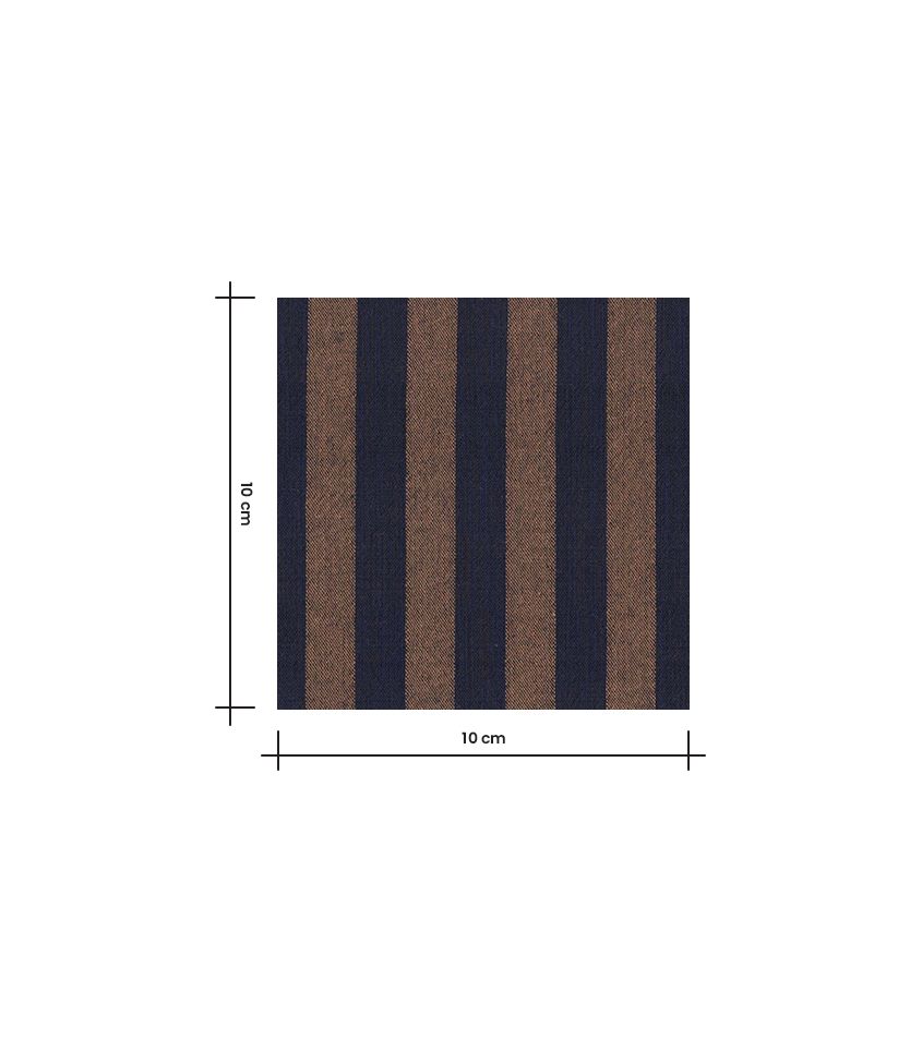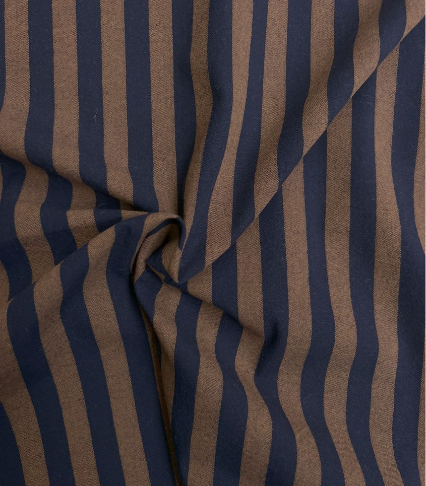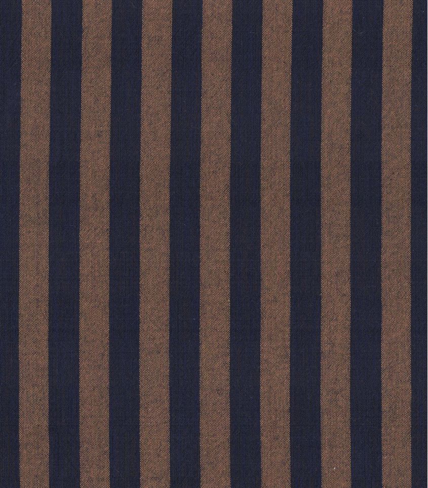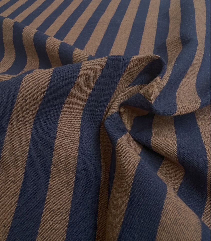 Un tissu en coton lavé rayure bicolore marron café et bleu marine. Les rayures sont régulière et d'environ 12mm de large.