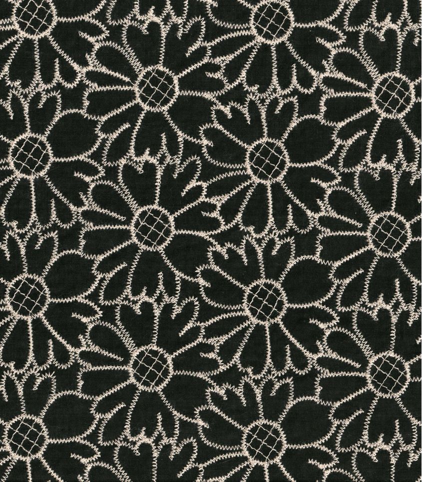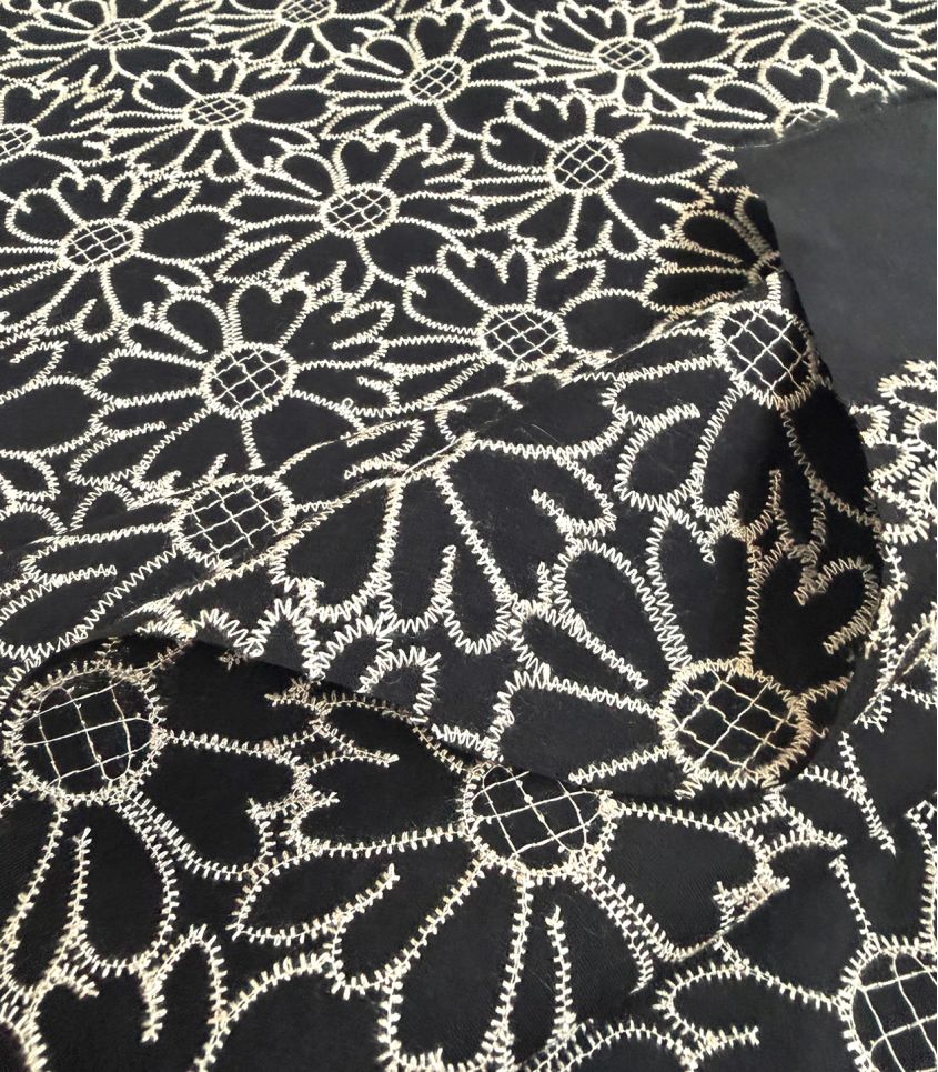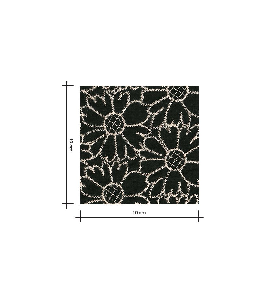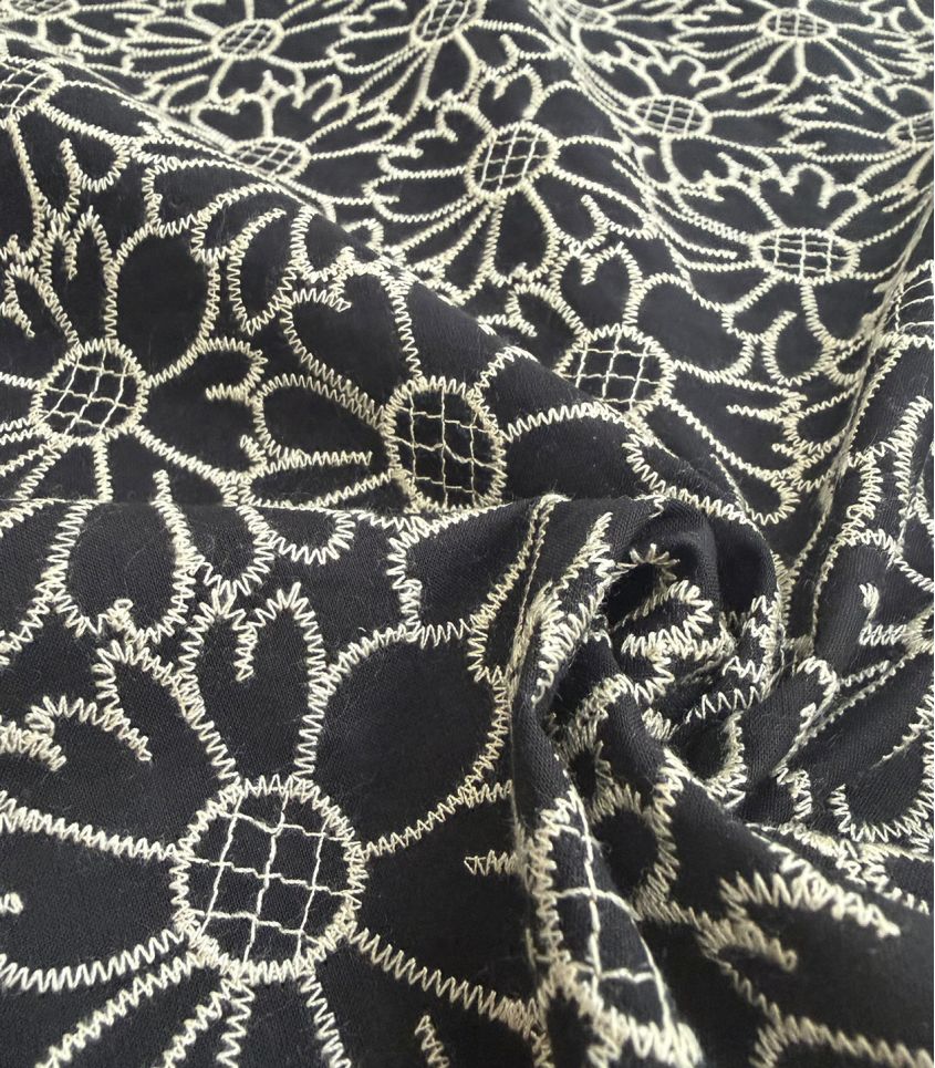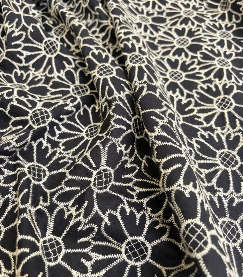 Tissu en coton fin noir intégralement brodé de marguerite écru. Élégance et légèreté, alliance idéale pour le printemps. Tissu légèrement transparent, prévoir une doublure selon les utilisations.