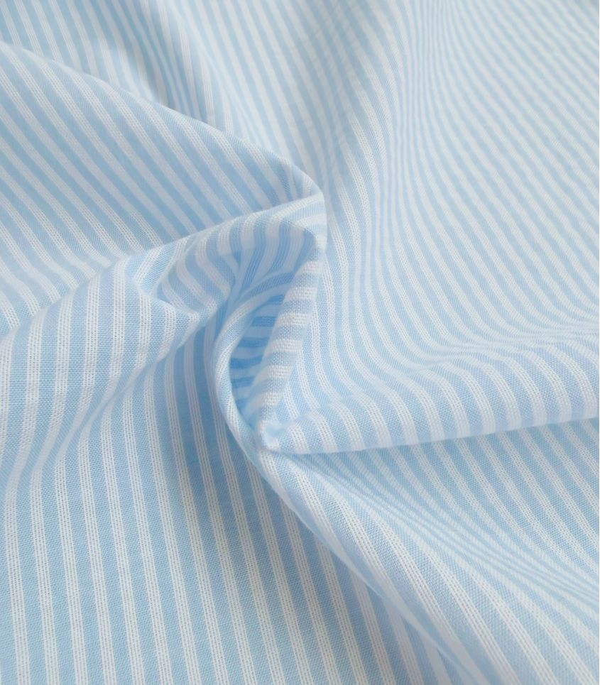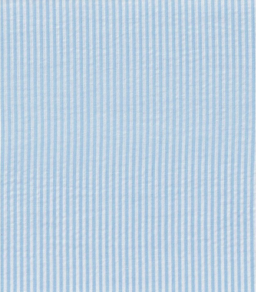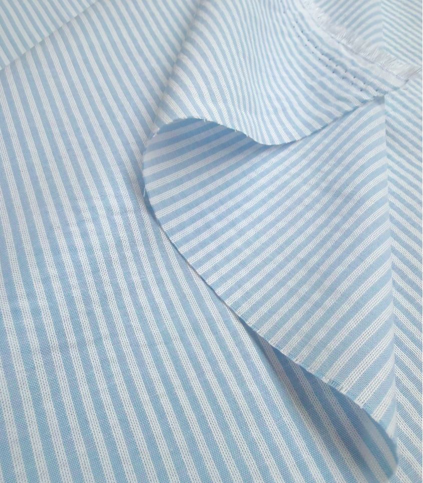 Tissu seersucker en pur coton rayé blanc et bleu ciel. Élégance et légèreté, alliance idéale pour le printemps. Tissu légèrement transparent, prévoir une doublure selon les utilisations.