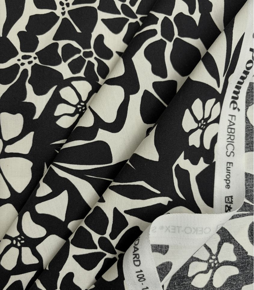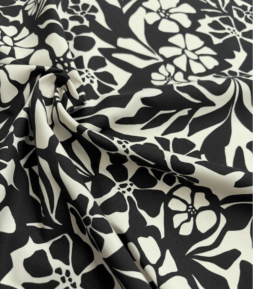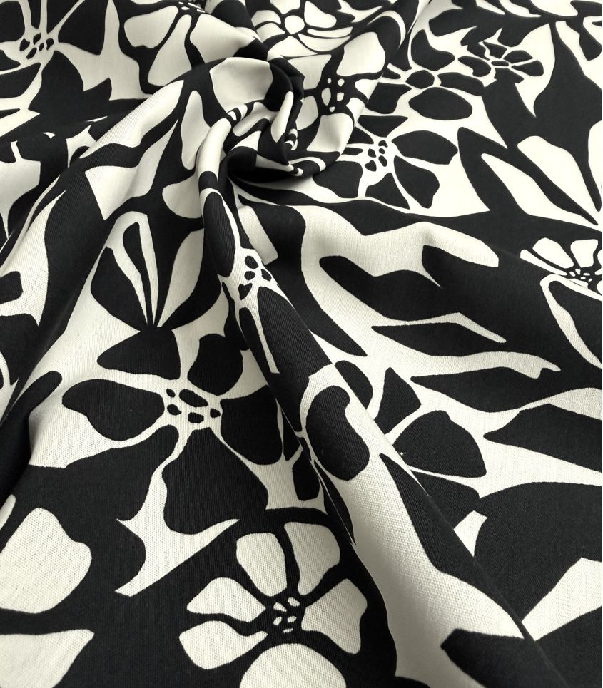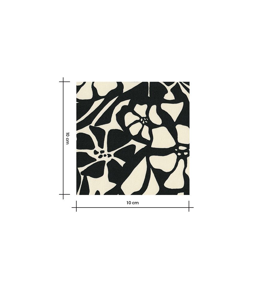 Un tissu léger, fluide et délicat, alliant la douceur du coton à la drapé de la viscose — parfait pour des créations féminines et confortables. Un imprimé floral sur fond noir, chic et sophistiqué, qui donne du caractère à vos projets tout en restant élégant et facile à associer.