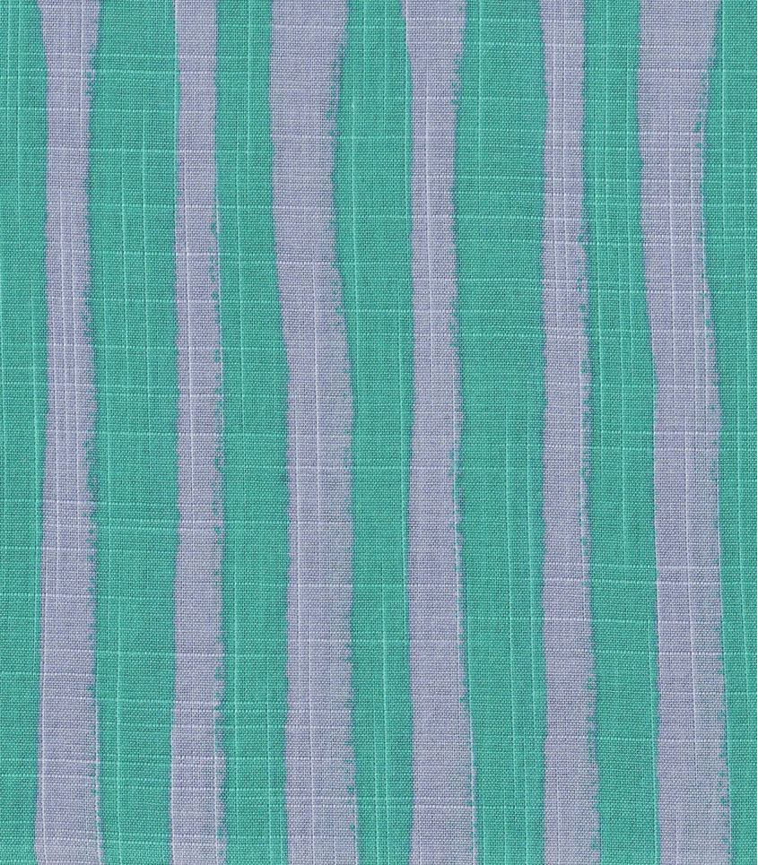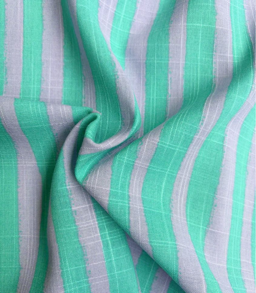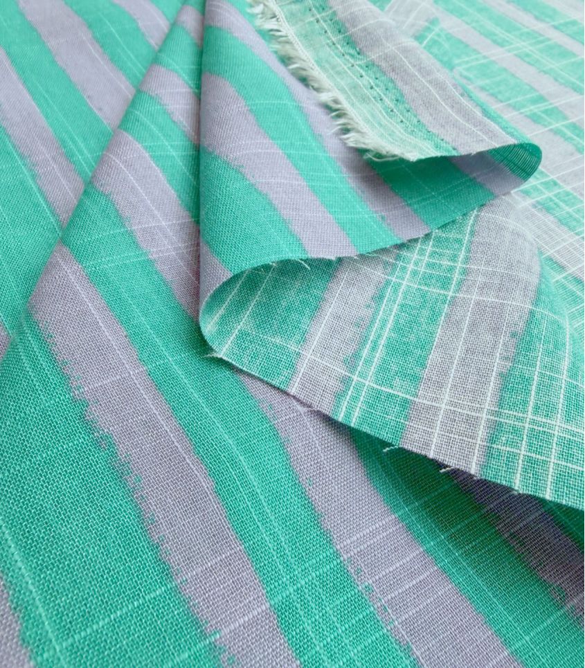 Tissu en mélange coton/viscose imprimé d'une rayure irrégulière comme tracée à la main. La rayure est bicolore alternant violet lilas et vert menthe. Tissu alliant la jolie trame du coton et la souplesse de la viscose. De plus le tissu est extrêmement doux et bien opaque, vous pouvez donc l'utiliser pour la réalisation de robe, pantalon, short, veste fluide ...