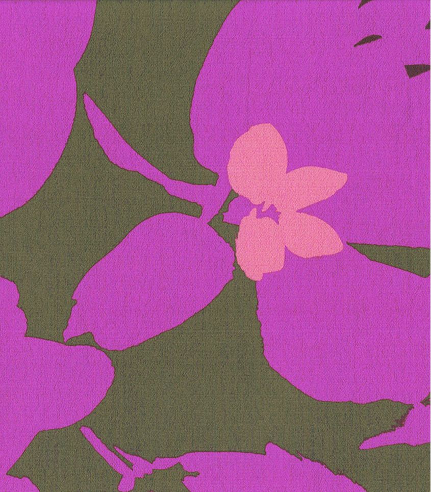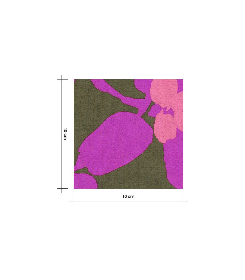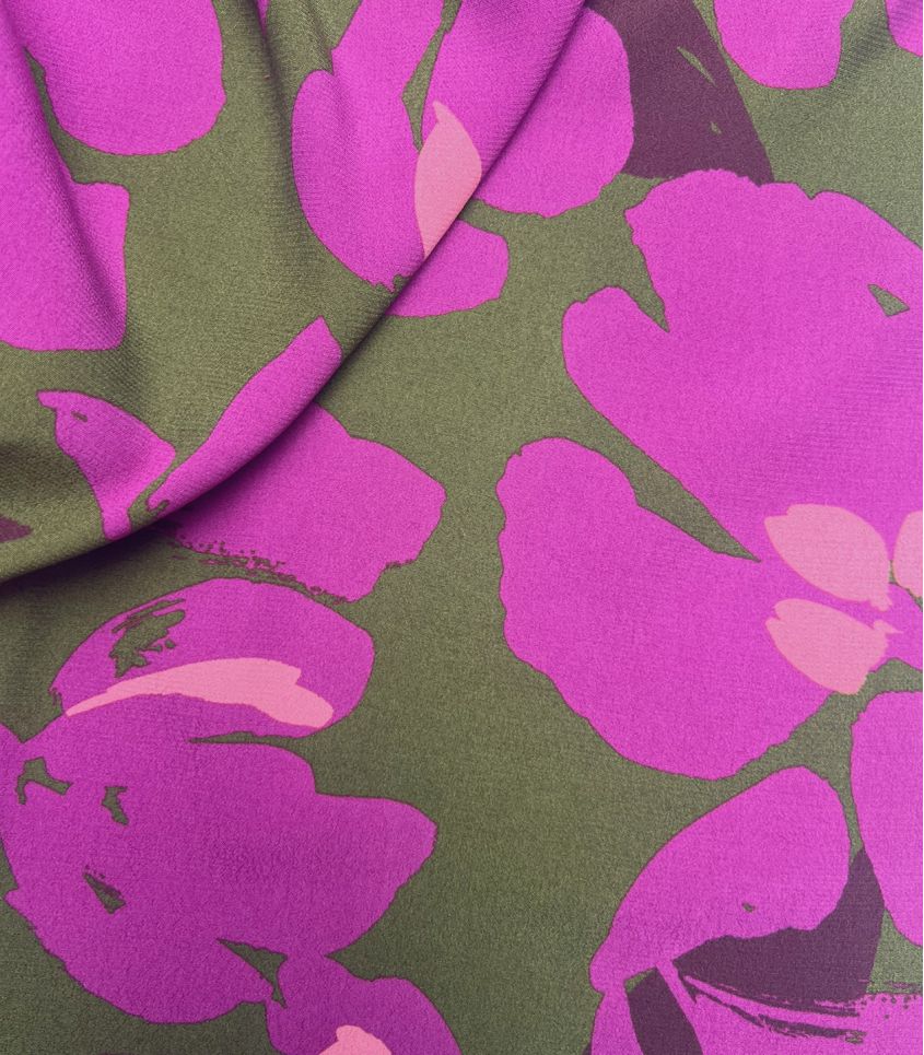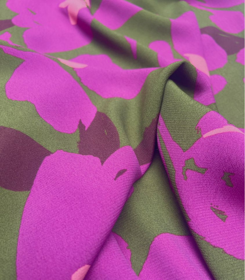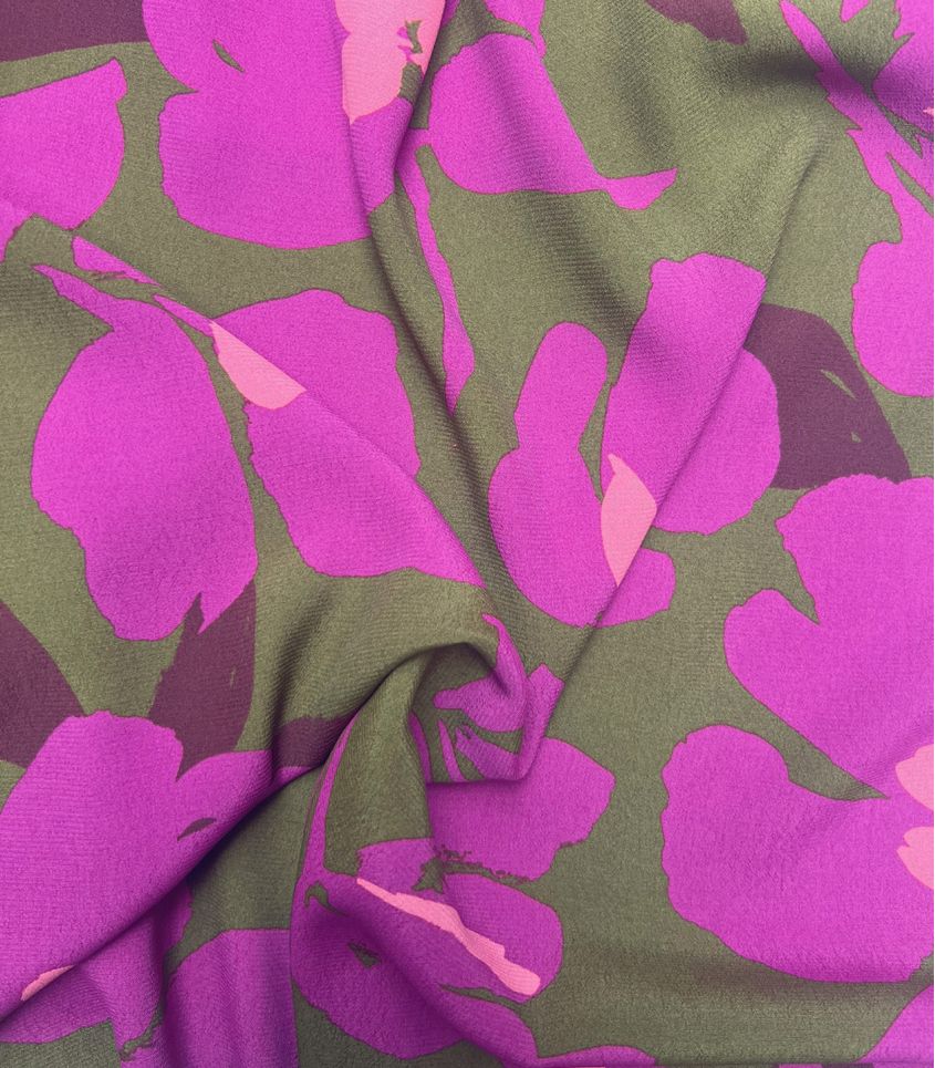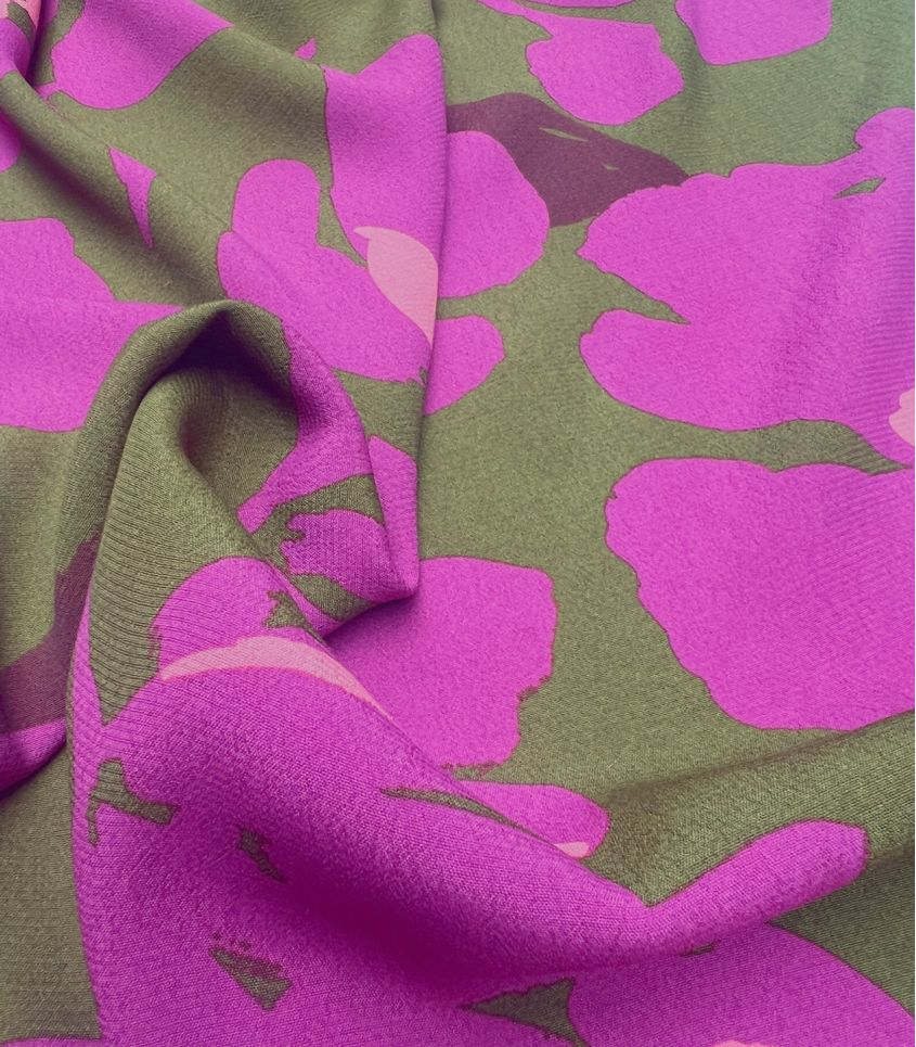Ce crêpe de viscose séduit par son imprimé audacieux de grands pétales de magnolia fuchsia, qui se détachent avec élégance sur un fond kaki profond.