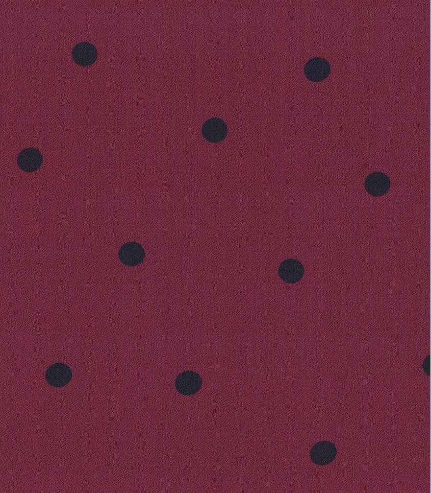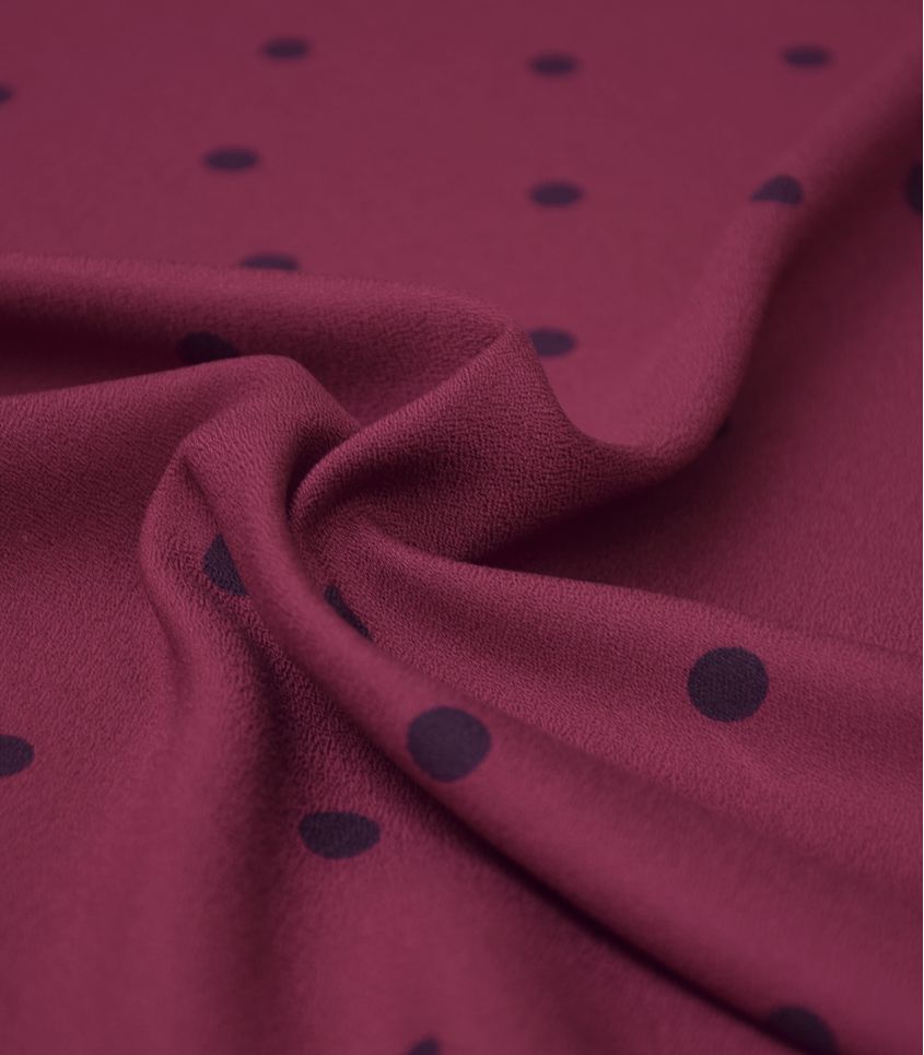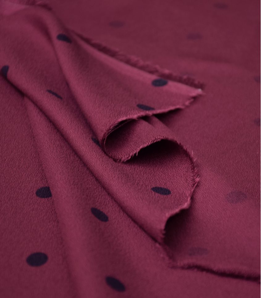 Crêpe de viscose bordeaux imprimé de pois bleu nuit (diamètre des pois 1cm). Tissu doux et fluide, il sera idéal pour réaliser des blouses, robes, et pantalons légers...