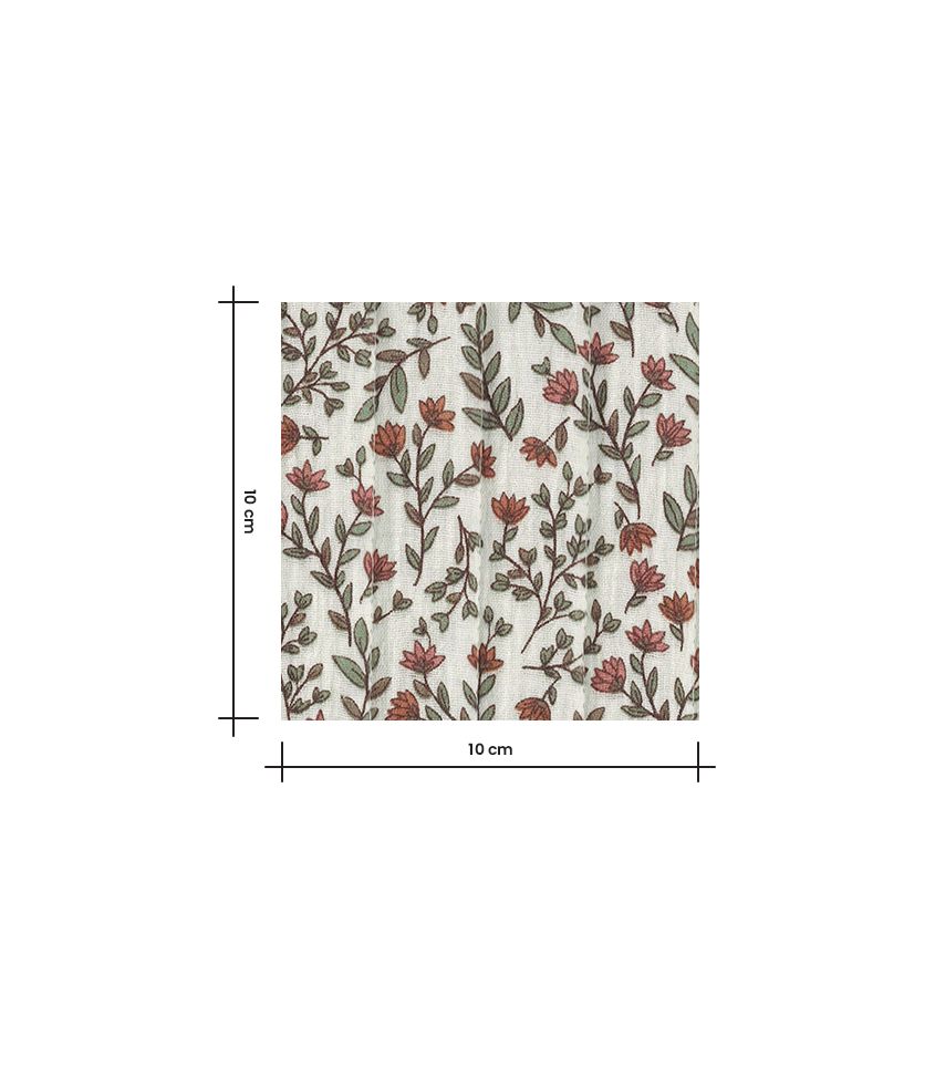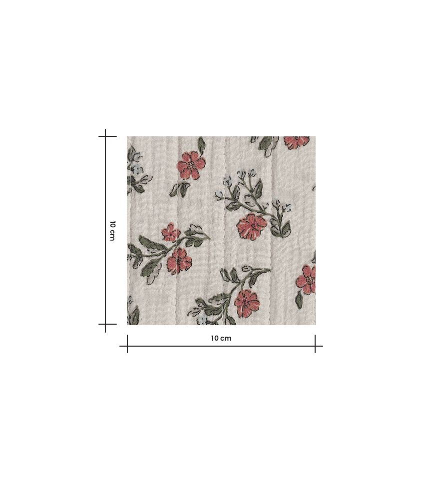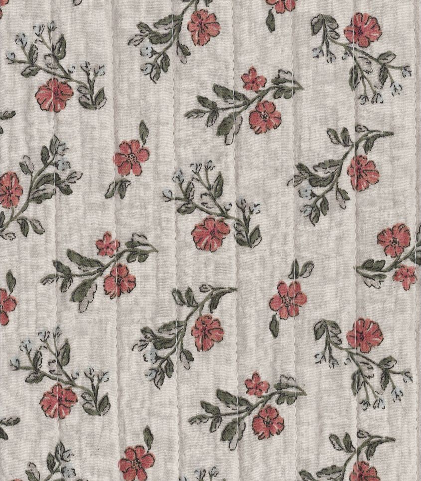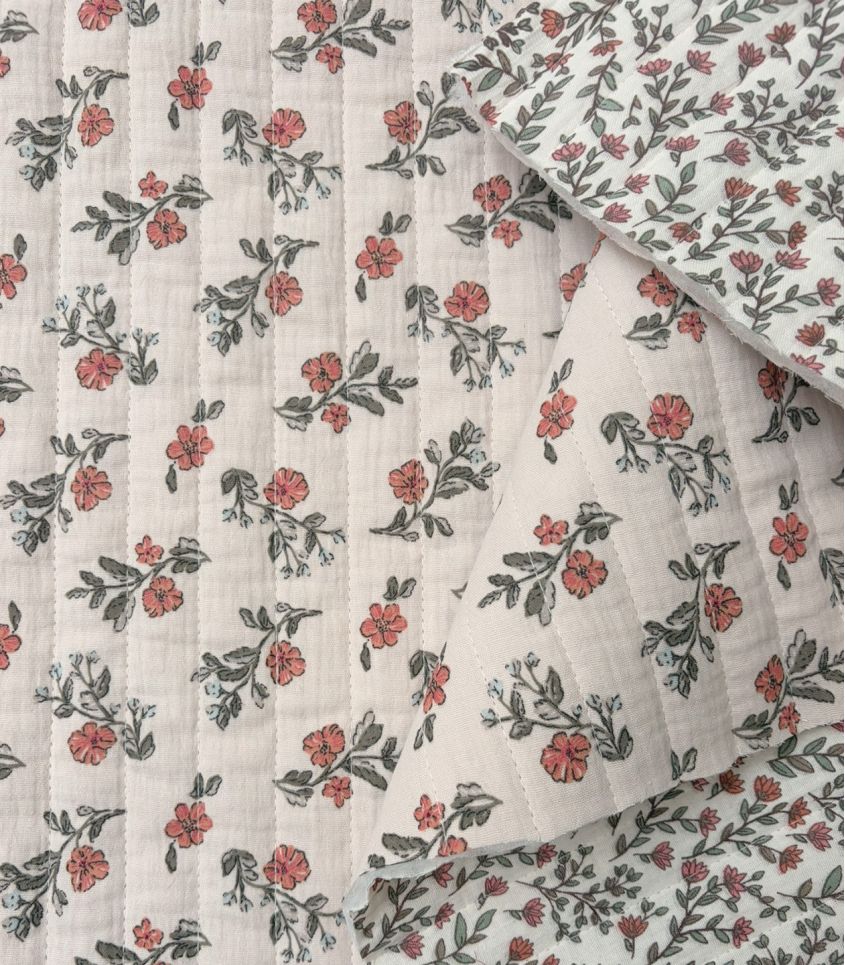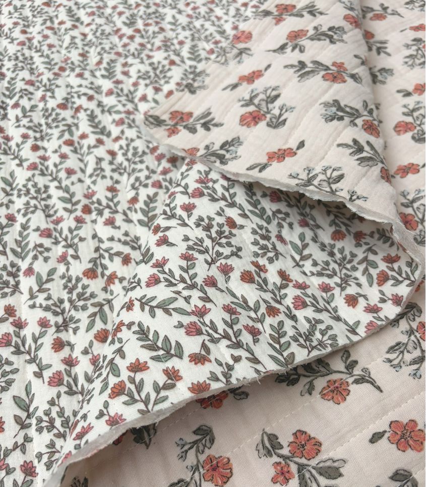 Tissu en double de gaze de coton matelassé, réversible. Une face imprimé d'un motif fleuri sur fond beige, verso petites fleurs . Tissu matelassé très souple et moelleux.