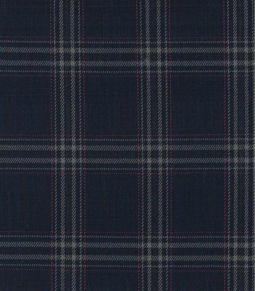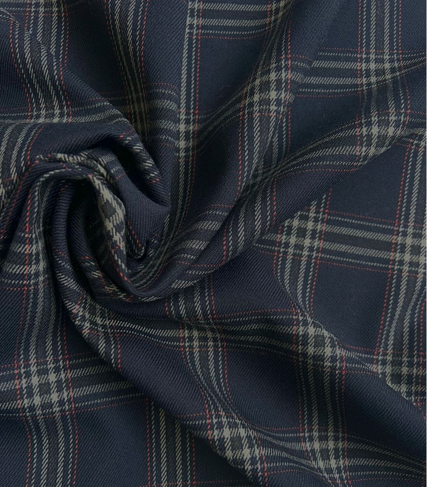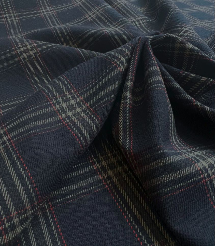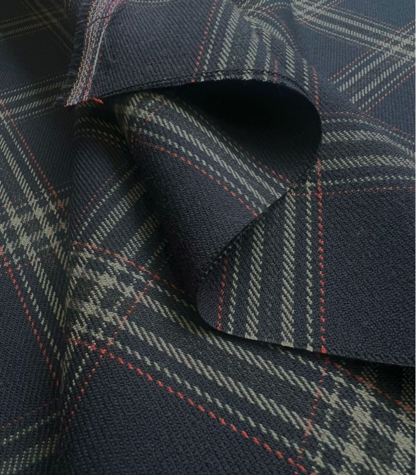 Un tissu en poly/viscose à l’élégance intemporelle, dont le tissage révèle un motif Écossais sur fond bleu marine sont tissés des carreaux gris rehaussés d'une fin rayure rouille.