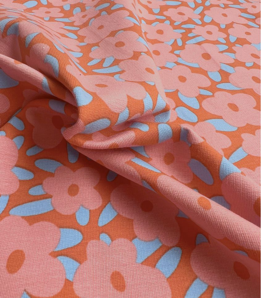 Un tissu sweat en coton doux, confortable et légèrement extensible, parfait pour vos projets couture cosy et décontractés. Un motif floral très pop, qui donnera du style à vos créations. Un grammage idéal pour la mi-saison, chaud sans être trop épais, facile à travailler.