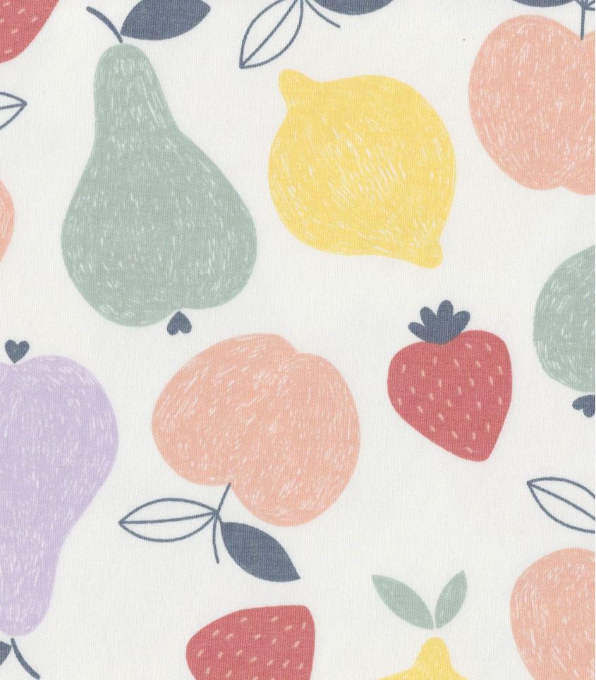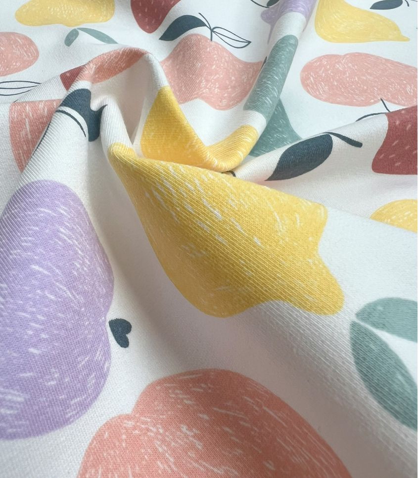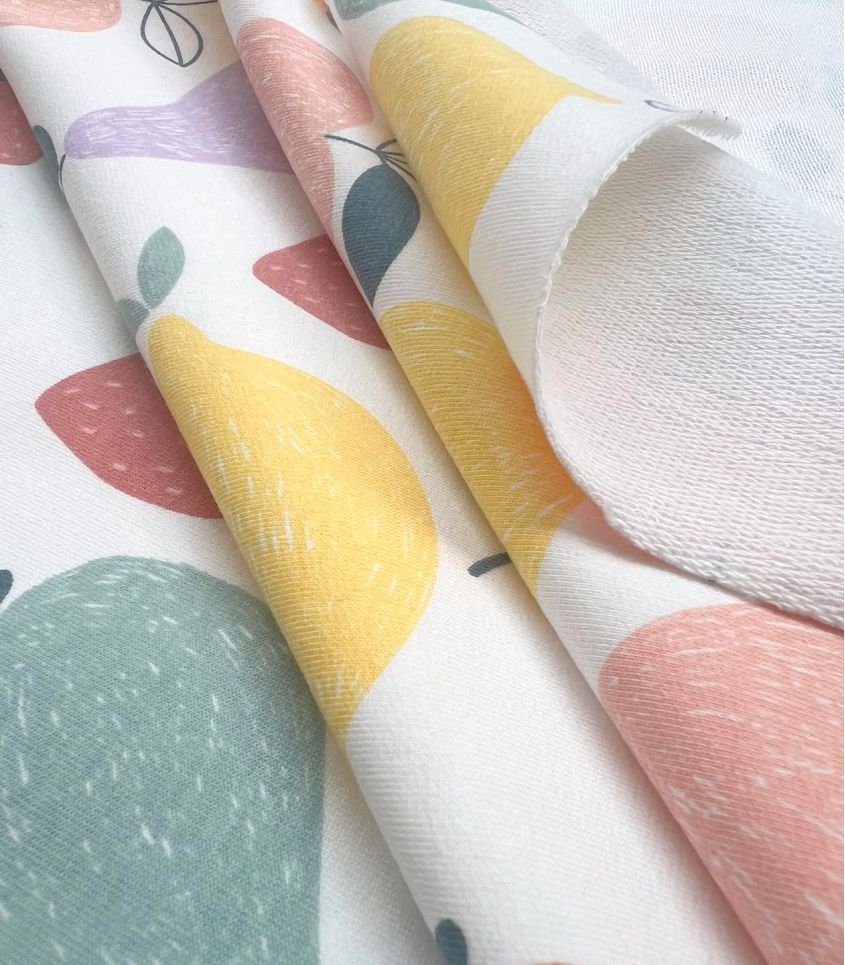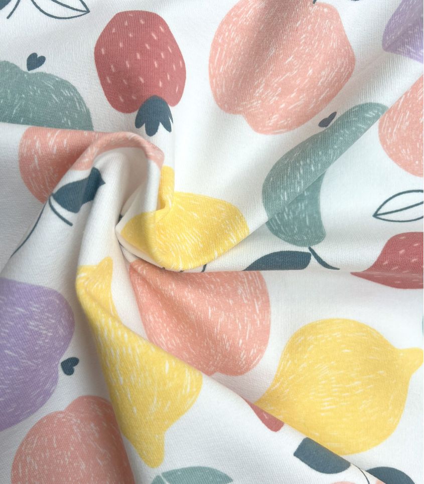 Un tissu french terry doux et confortable à motif fruits, parfait pour des créations casual et confortables pour toute la famille. Tissu respirant et extensible, très agréable pour les vêtements pour enfants ou sportifs.