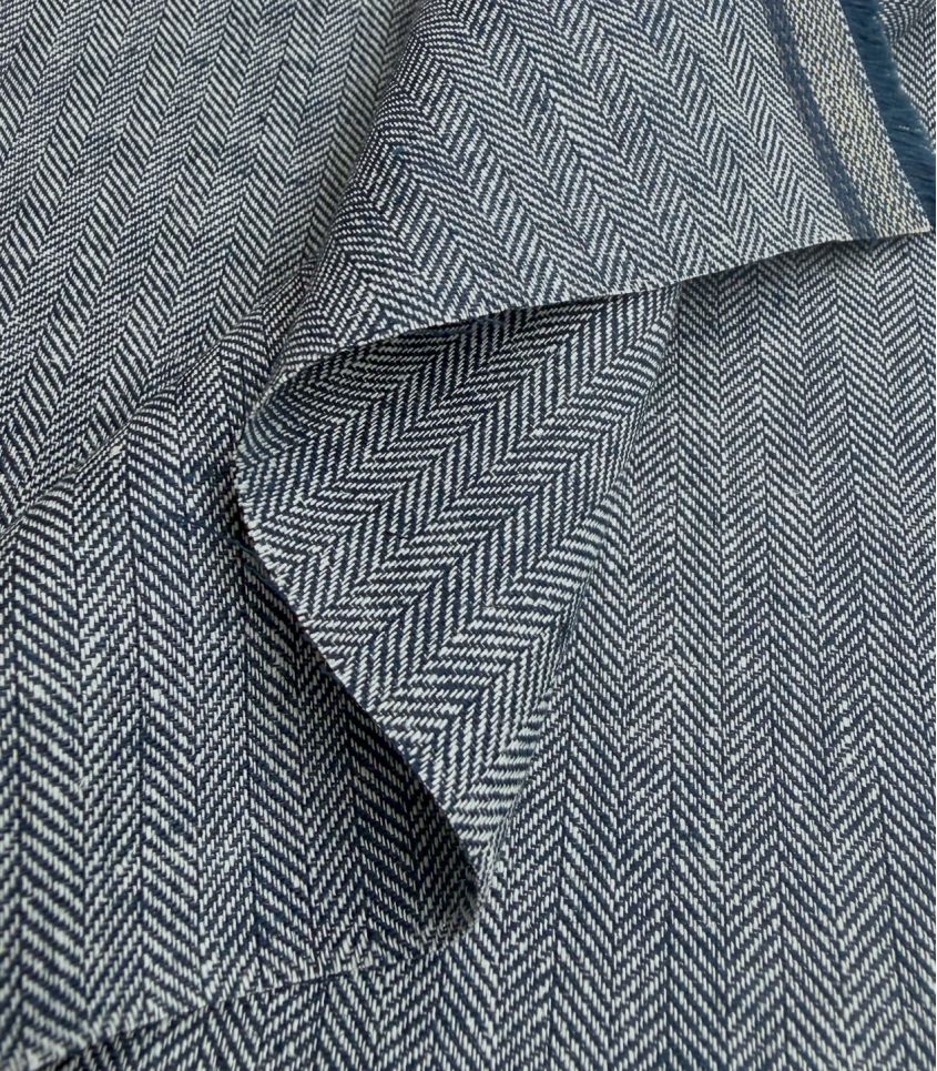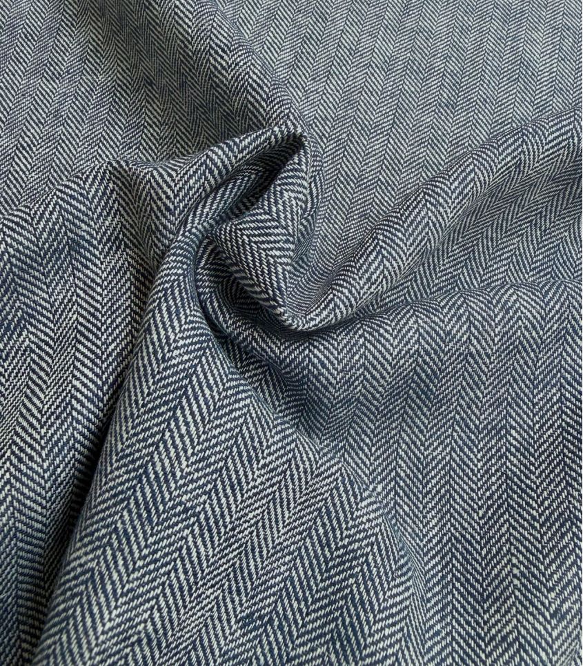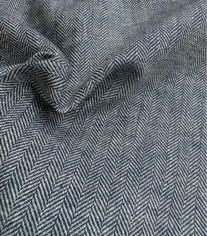 Tissu en mélange lin/coton au tissage chevrons bicolore blanc et bleu marine. Tissu léger, idéal pour vos créations estivales, chemise, pantalon souple, robe ...