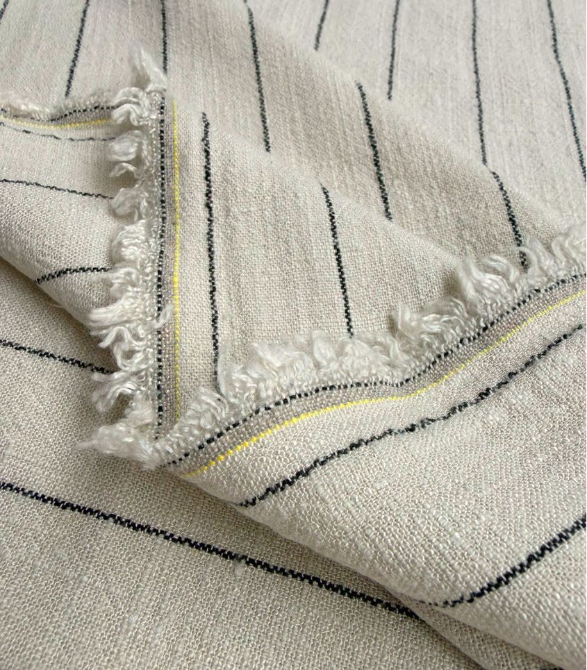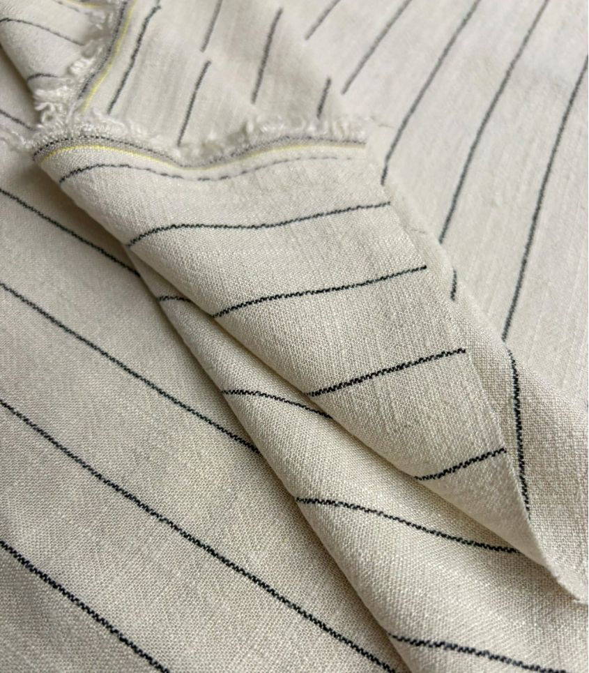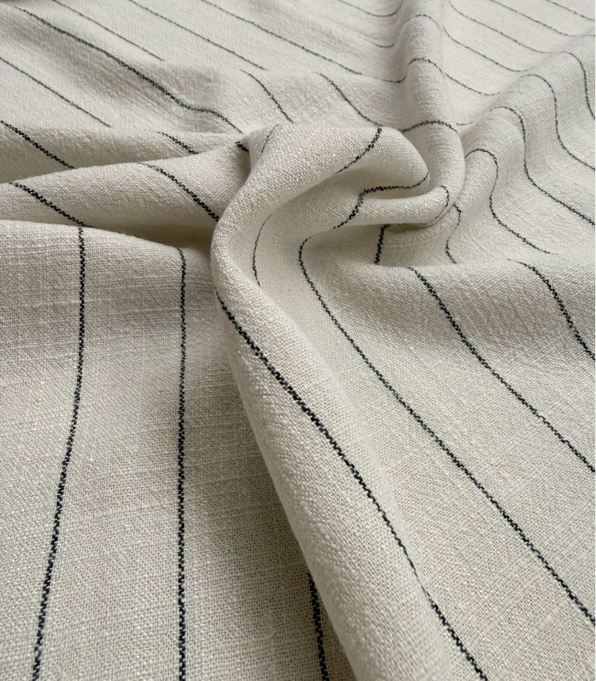 Tissu en mélange lin/viscose coloris beige parsemé d'une fine rayure noire. Tissu alliant la jolie trame du lin et la souplesse de la viscose. De plus le tissu est extrêmement doux et bien opaque, vous pouvez donc l'utiliser pour la réalisation de robe, pantalon, short, veste fluide ...
