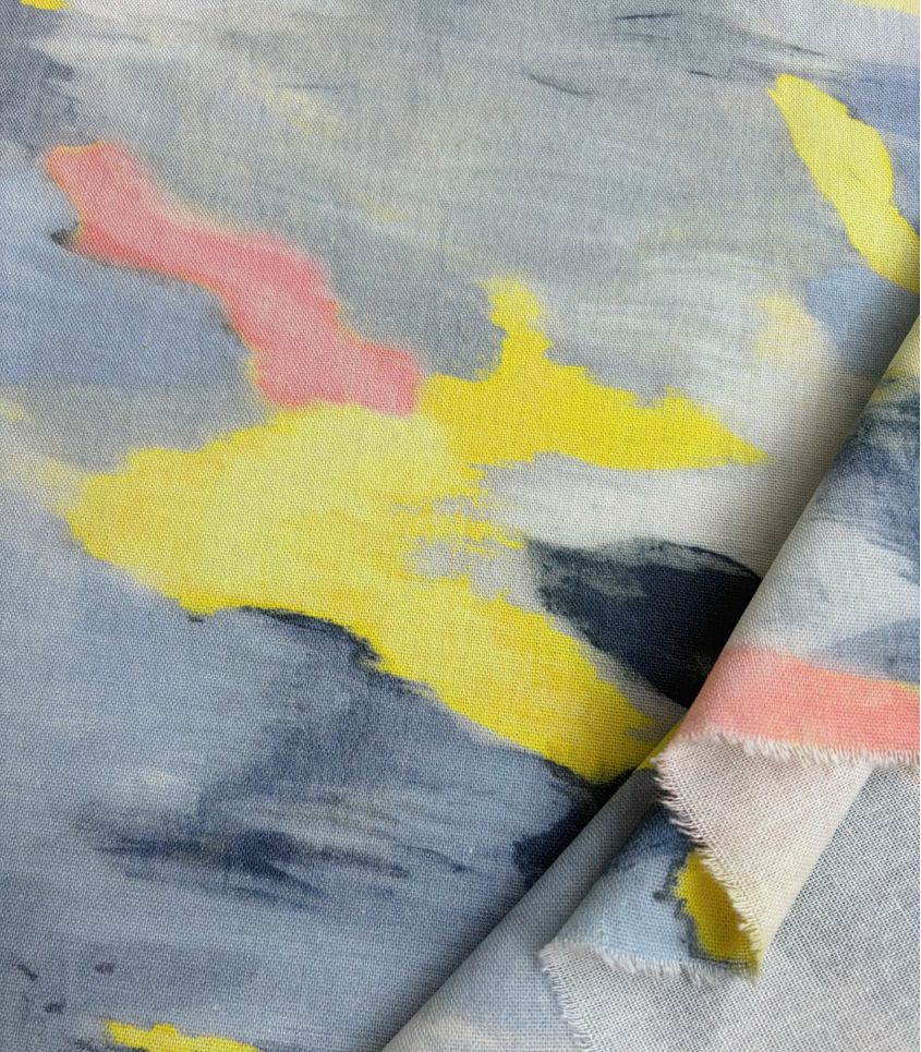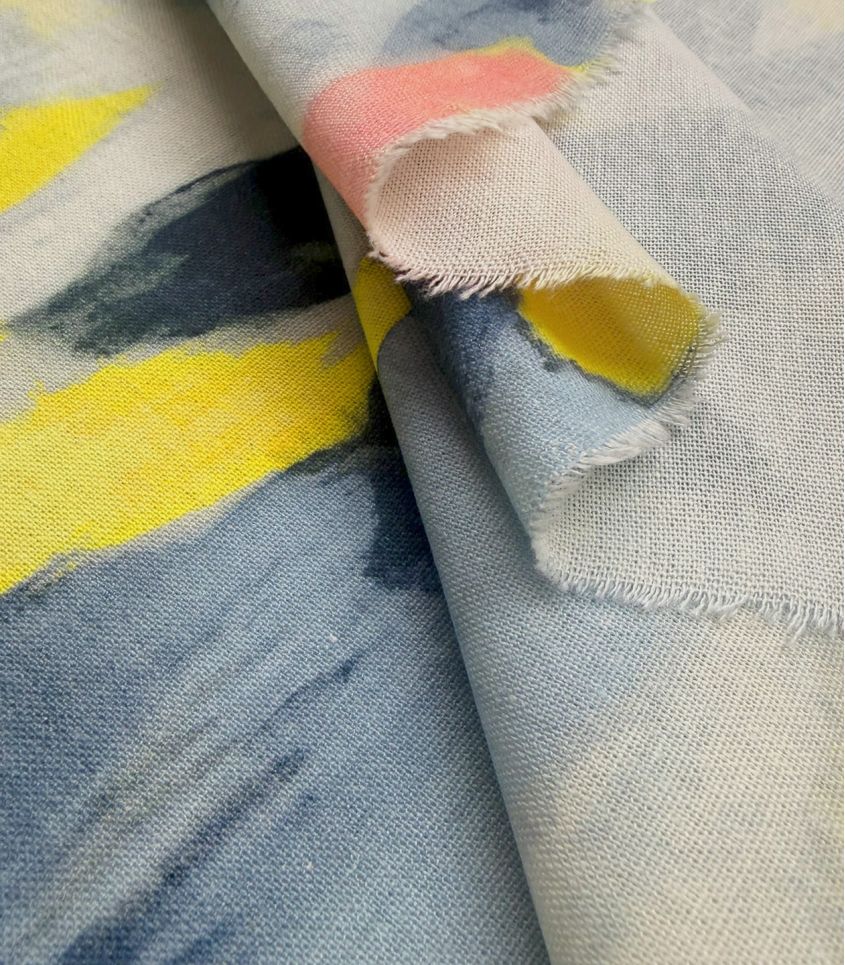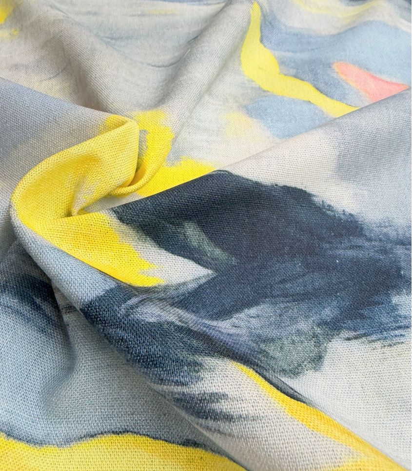 Tissu en mélange lin/viscose imprimé d'un motif organique dans un camaïeu allant du bleu ciel au gris anthracite, quelques touches de jaunes viennent rehausser le tout. Tissu alliant la jolie trame du lin et la souplesse de la viscose. De plus le tissu est extrêmement doux et bien opaque, vous pouvez donc l'utiliser pour la réalisation de robe, pantalon, short, veste fluide ...