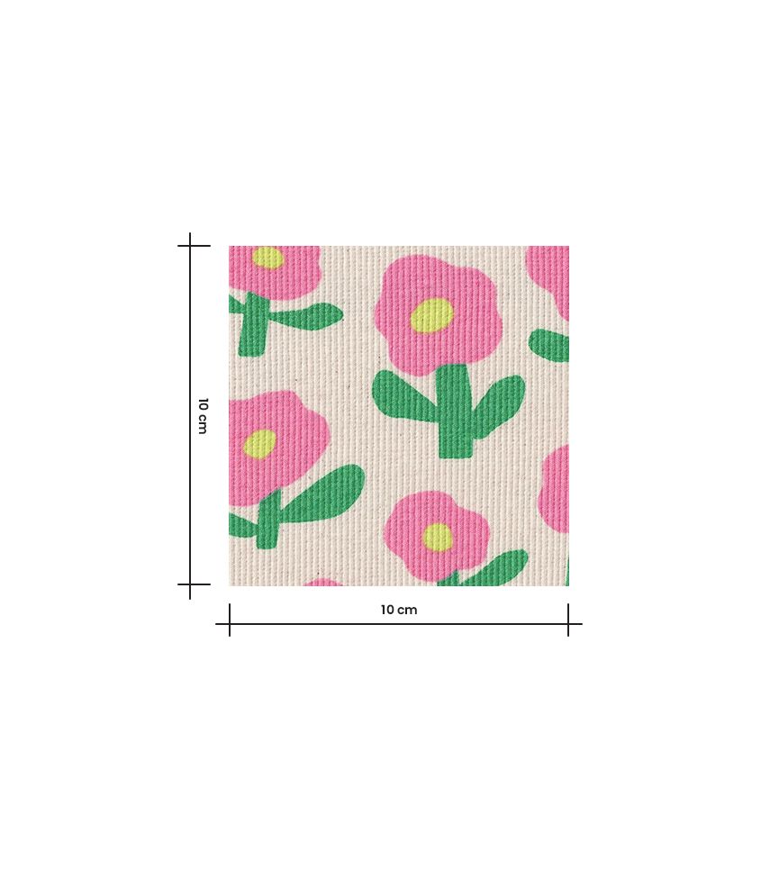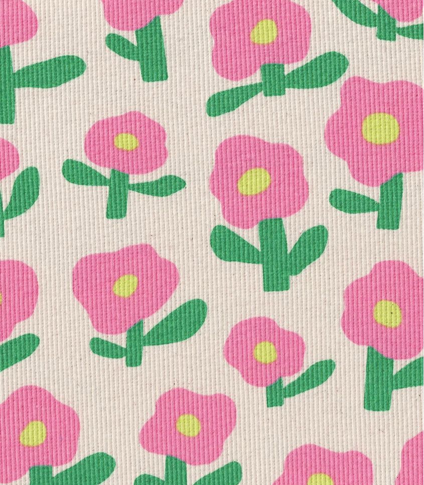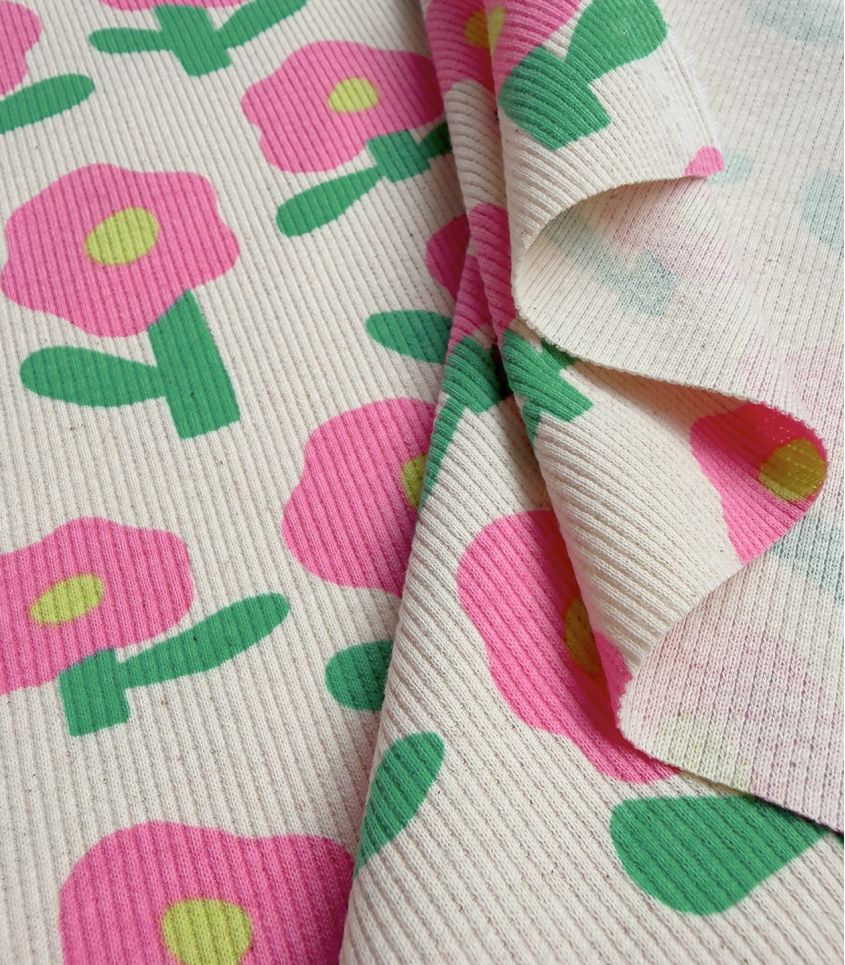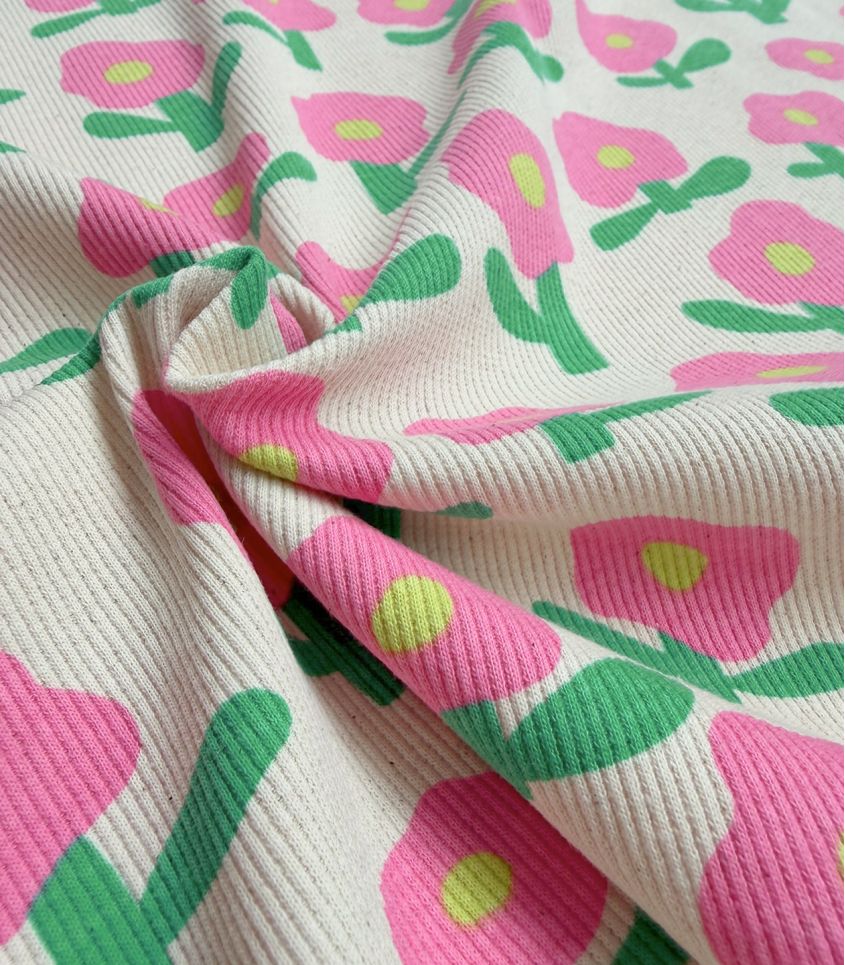 Tissu maille côtelée écrue en pure coton parsemé de fleurs pops roses. La côte fait 2mm de large. Tissu idéal pour la réalisation de t-shirt, legging, body pour bébé...