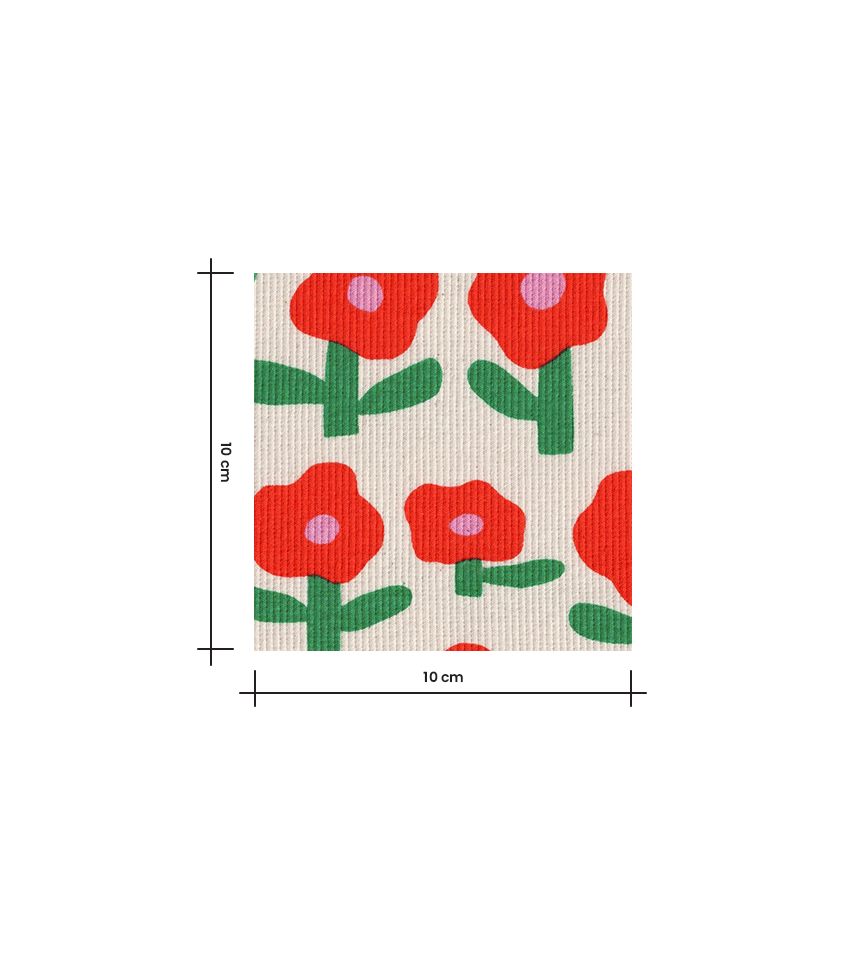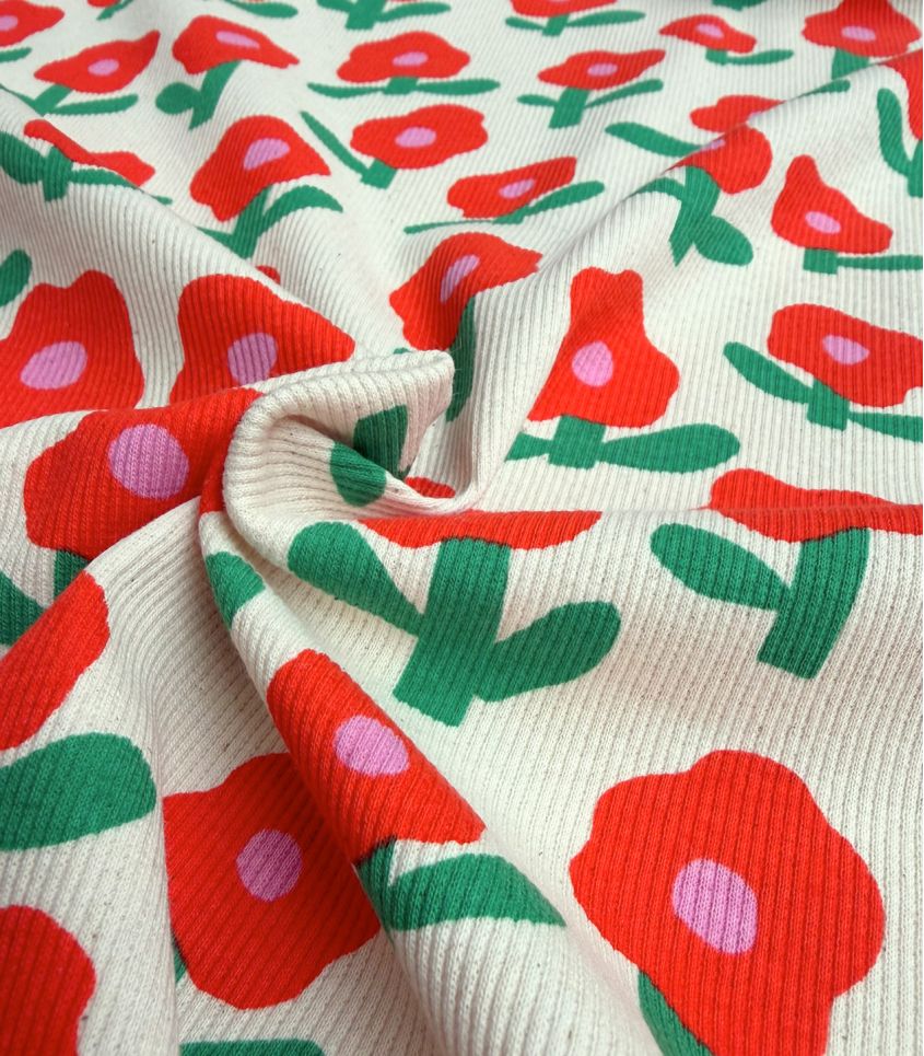Tissu maille côtelée écrue en pure coton parsemé de fleurs pops rouges. La côte fait 2mm de large. Tissu idéal pour la réalisation de t-shirt, legging, body pour bébé...