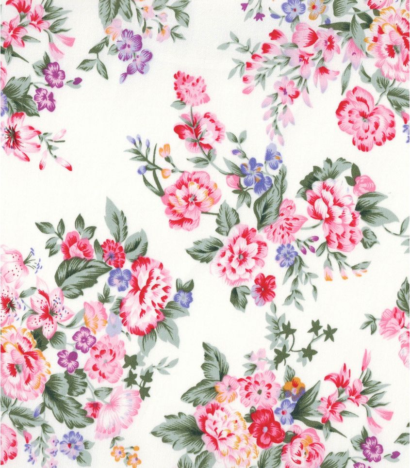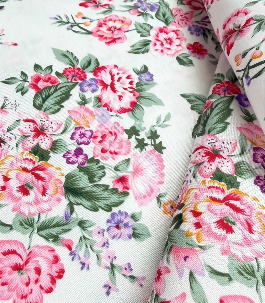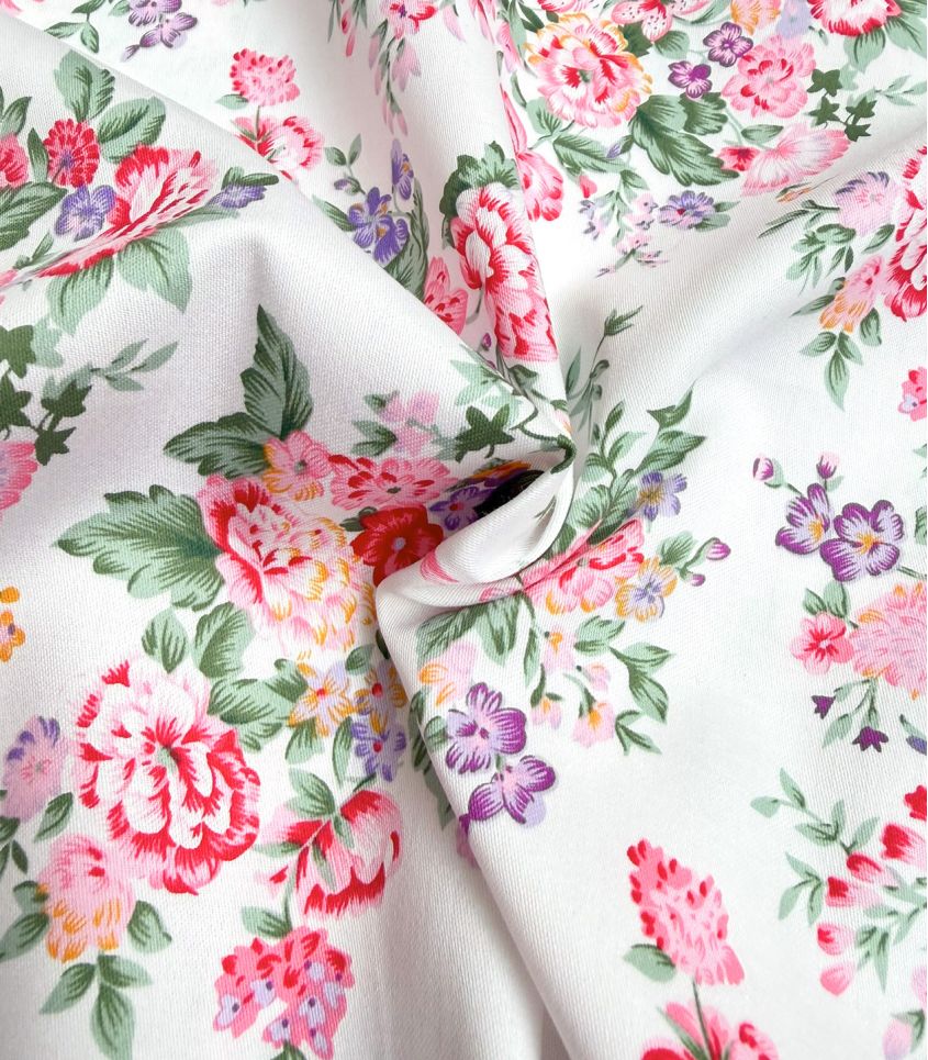 Satin de coton relativement fin imprimé de jolis bouquets de fleurs romantiques. Tombé souple, idéal pour la réalisation de blouses, robes ou de jupes.