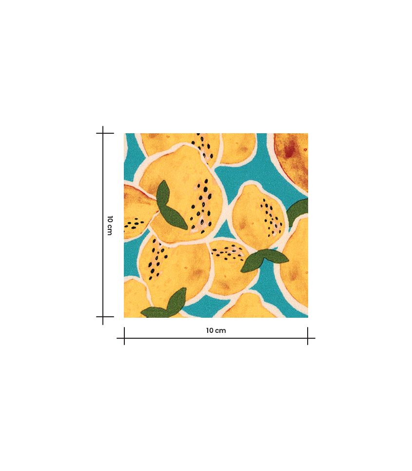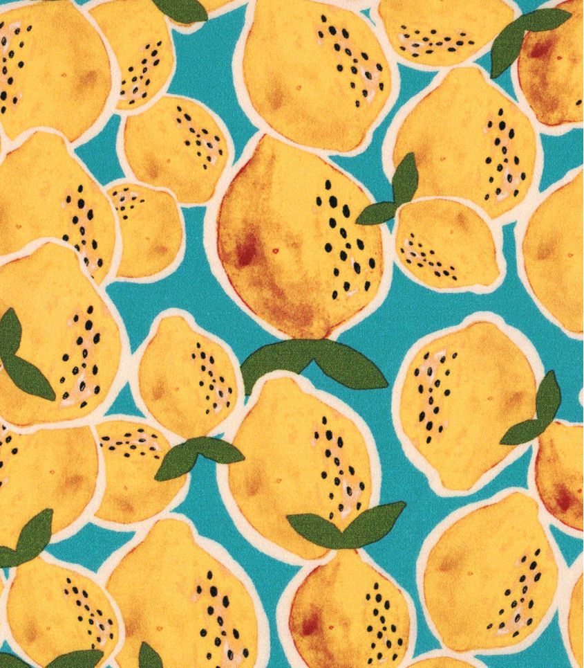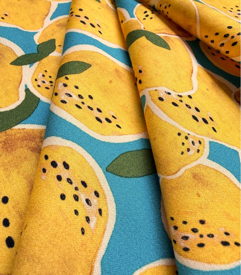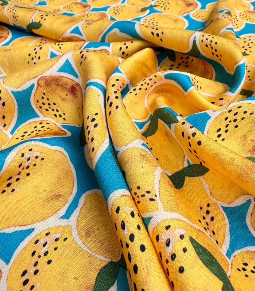 Ce tissu en satin de viscose, imprimé de citrons, ce tissu évoque instantanément la fraîcheur des journées d’été. Ses citrons jaune éclatant, contrastent avec un fond bleu lumineux.