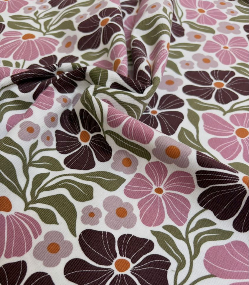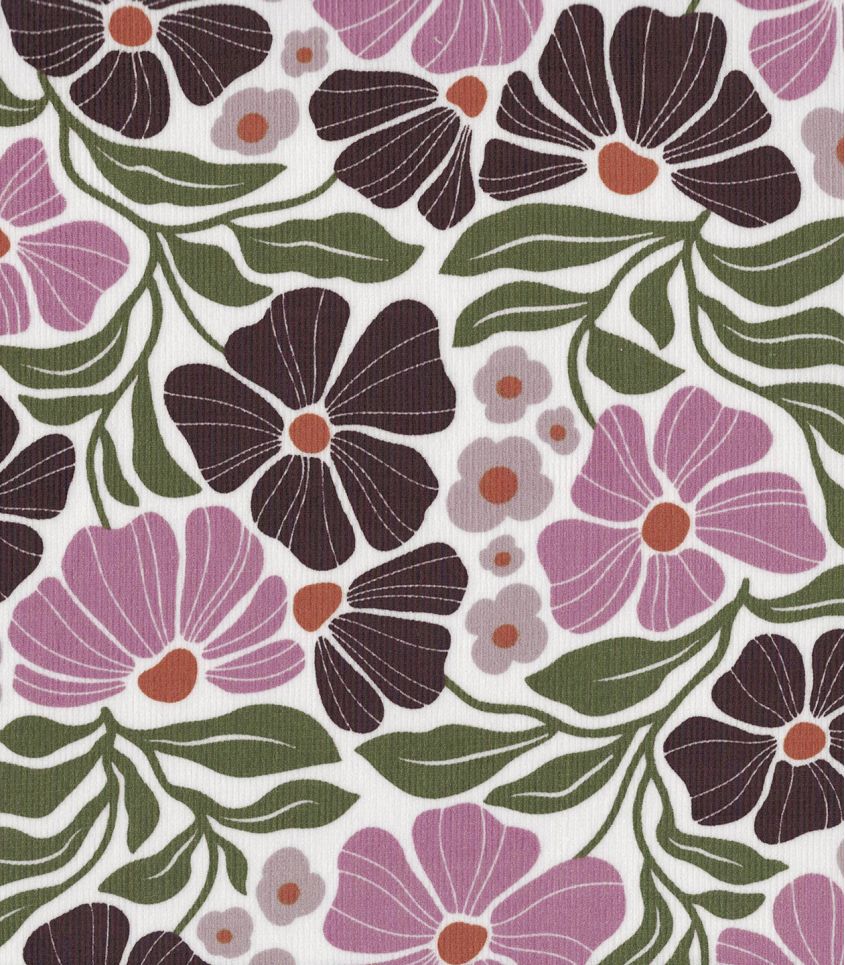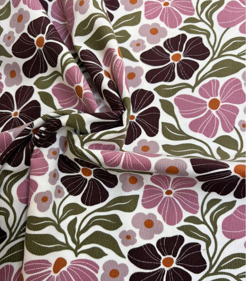Velours milleraies fin en pur coton fond blanc parsemé de fleurs roses et violettes.. Tissu d'une très jolie qualité fine et souple. A utiliser pour la réalisation de blouses, robes, vêtements pour enfants/bébé ...