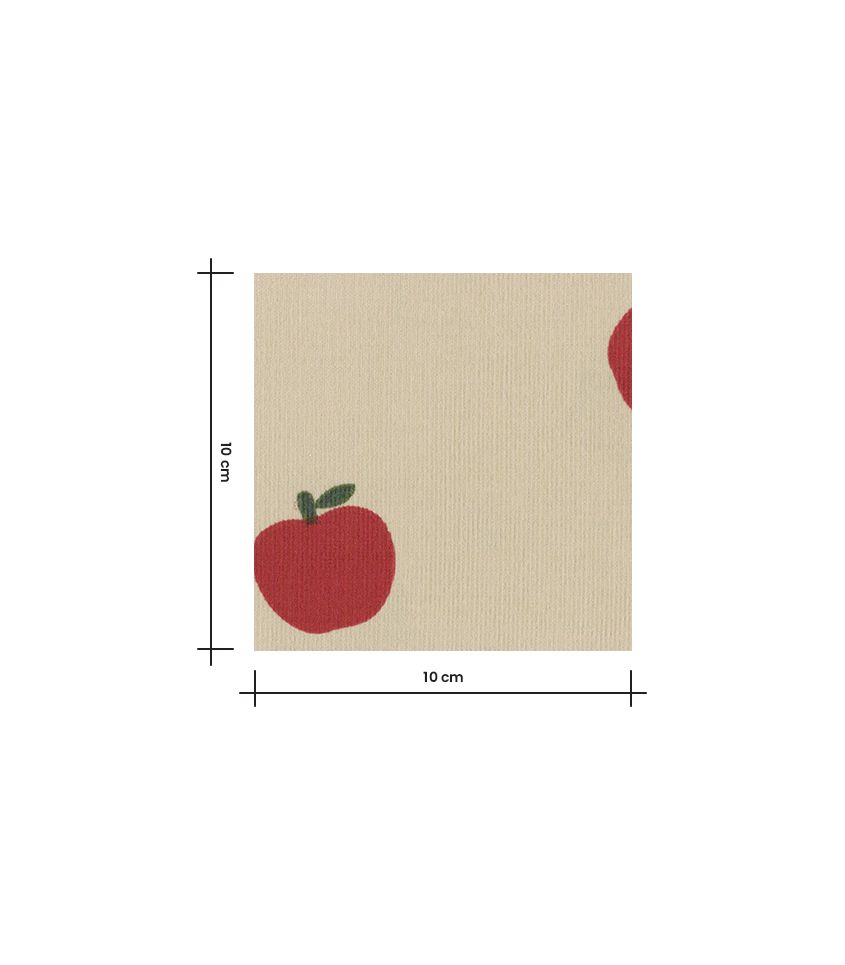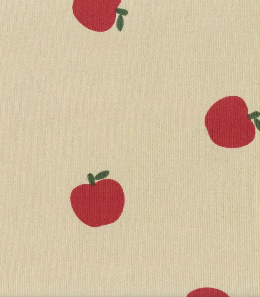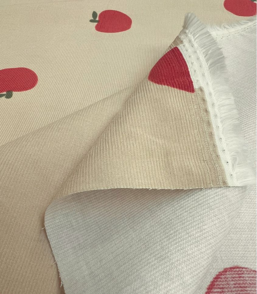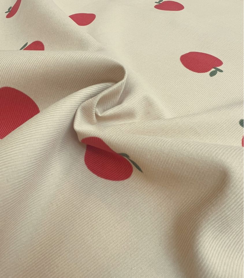 Velours milleraies fin en pur coton fond beige parsemé de jolies pommes rouges. Tissu d'une très jolie qualité fine et souple. A utiliser pour la réalisation de blouses, robes, vêtements pour enfants/bébé ...