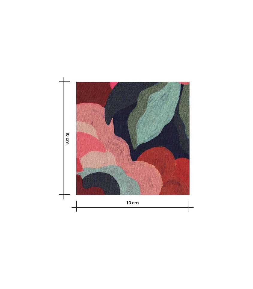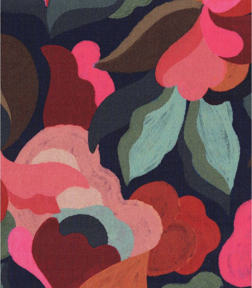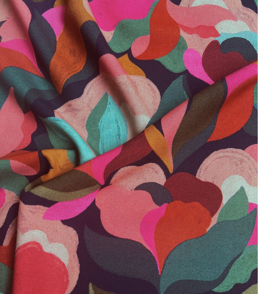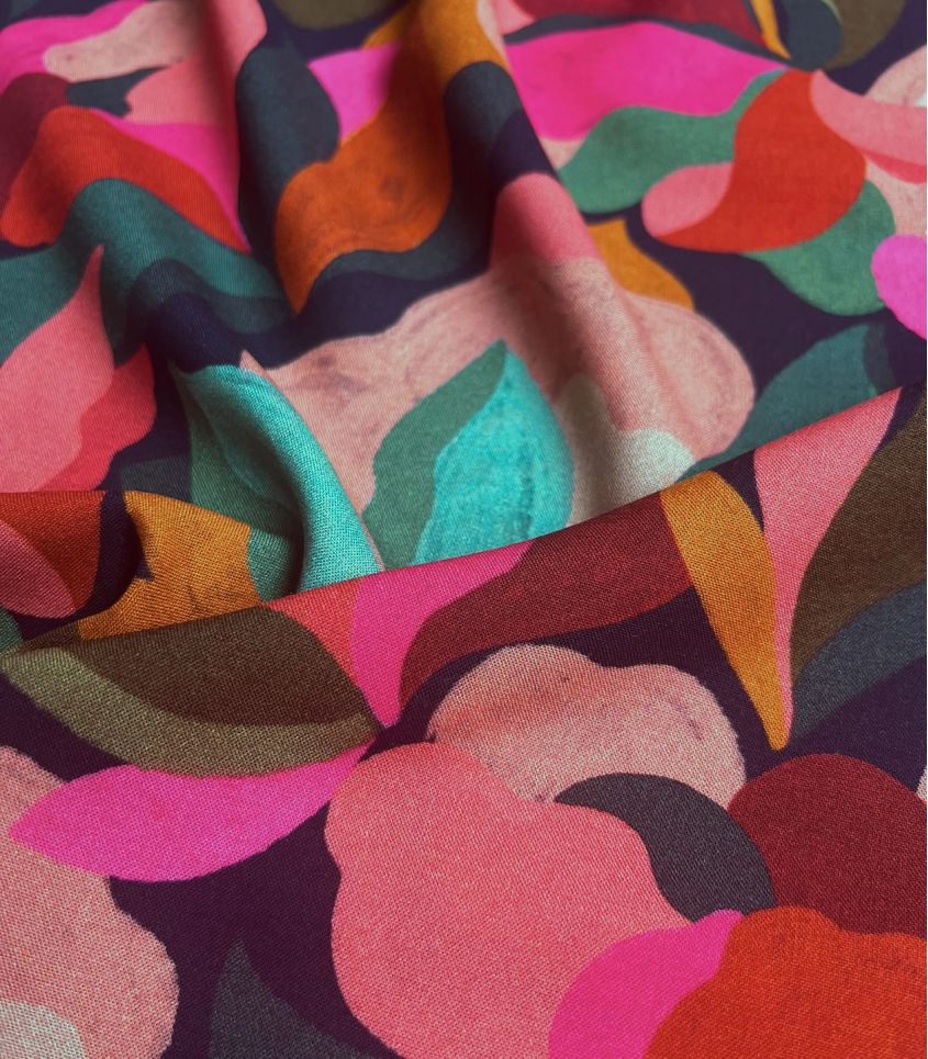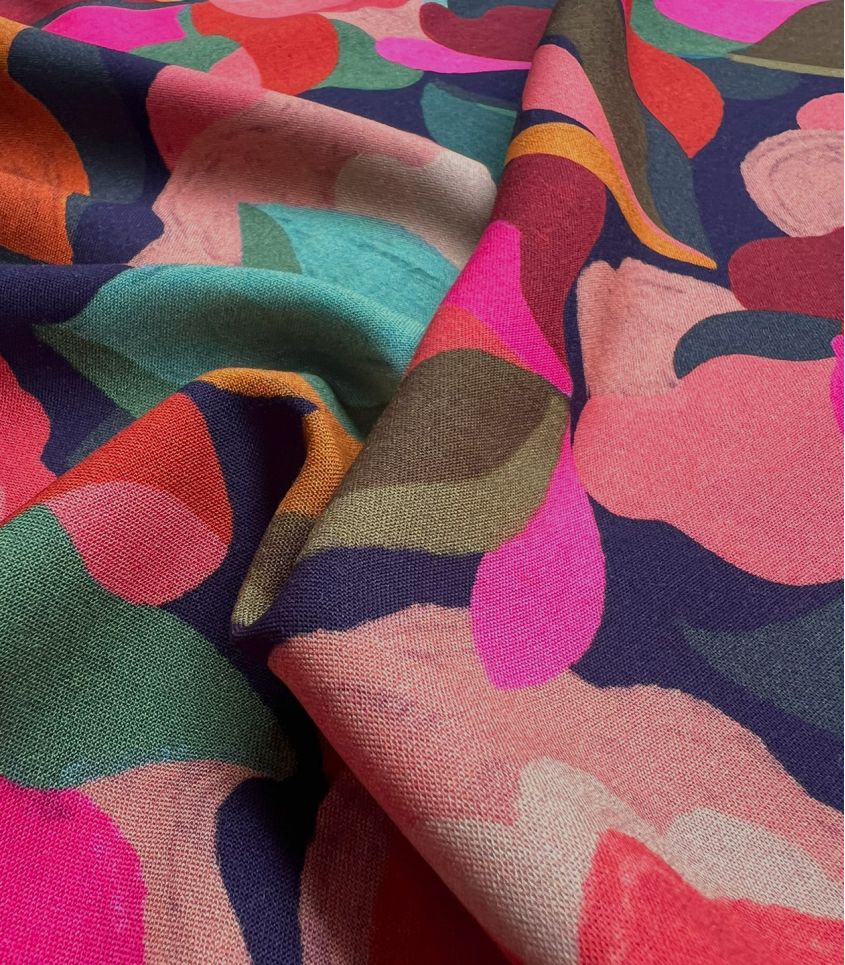 Viscose au motif graphique et fleuri dans les tons rose rose fuchsia, vert kaki, brun et violet sur un fond bleu marine. Tissu au tombé fluide idéal pour la réalisation de blouses, robes ou de jupes. Ce tissu est bien opaque et ne nécessitera pas de doublure.