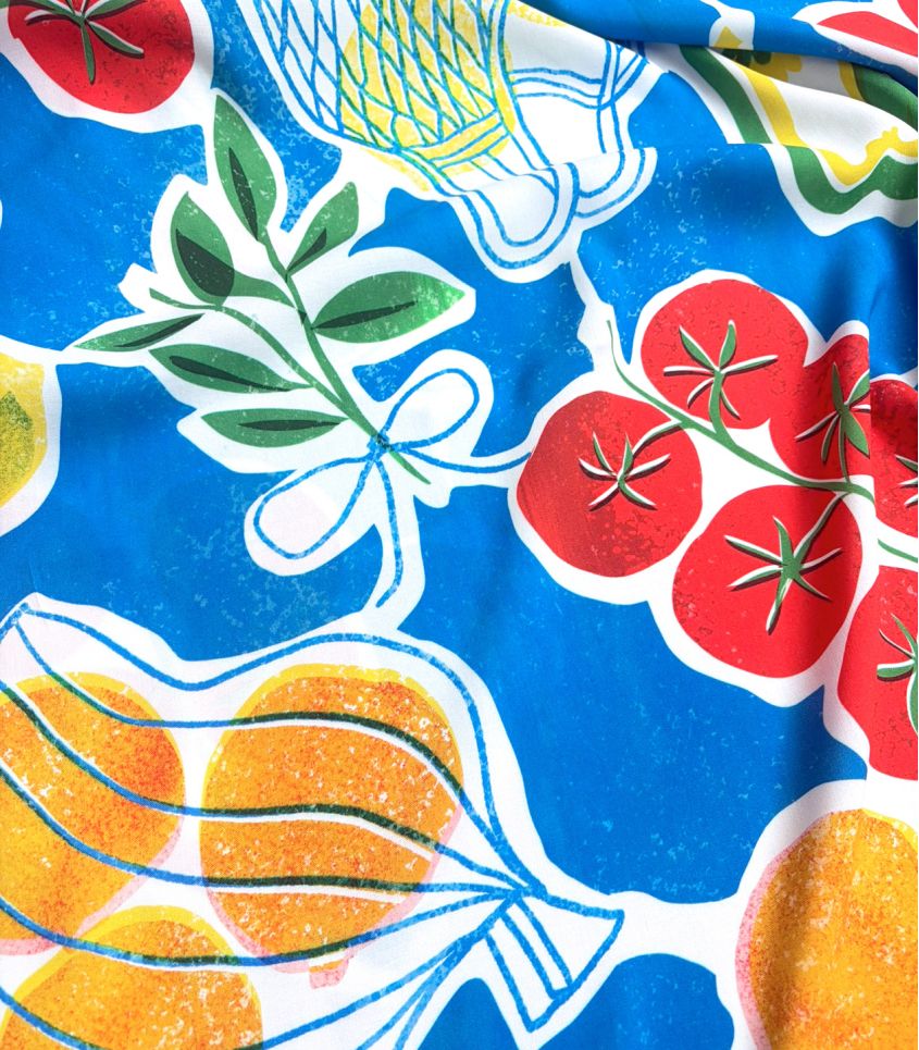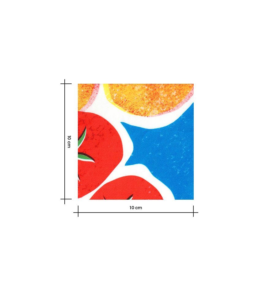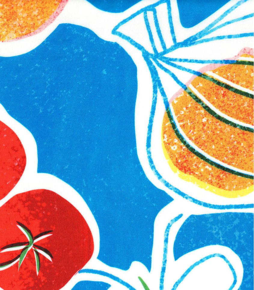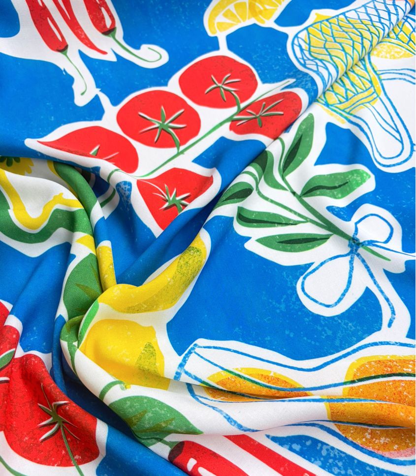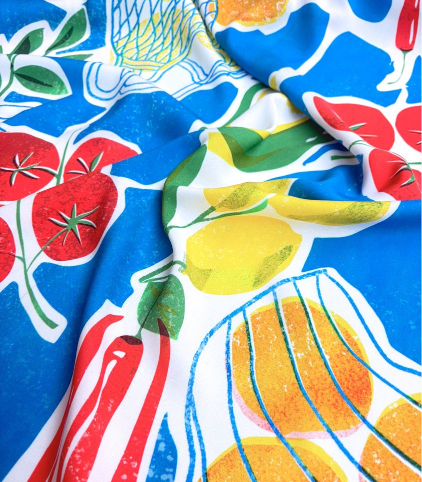 Ce tissu en viscose, à l’imprimé joyeux et gourmand, évoque l’ambiance animée des marchés d’été. Tomates, oranges, citrons et piments aux accents espagnols s’y mêlent avec légèreté, créant une atmosphère méditerranéenne fraîche et ensoleillée. Un motif plein de vitalité, idéal pour des créations estivales pleines de caractère.