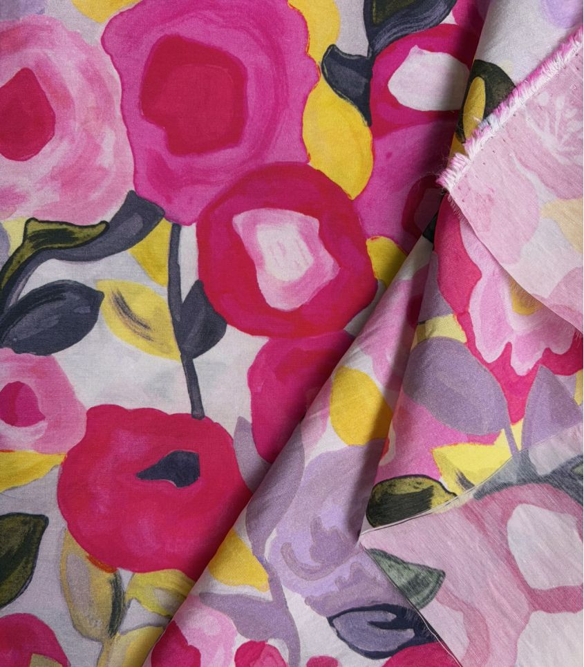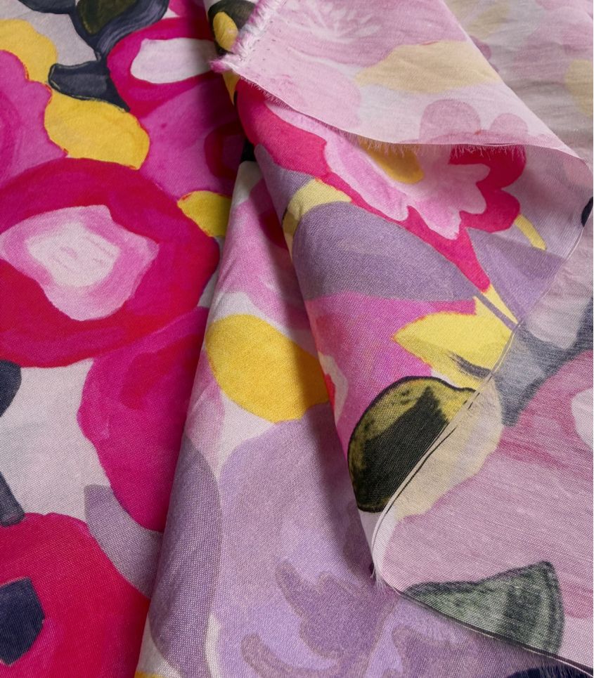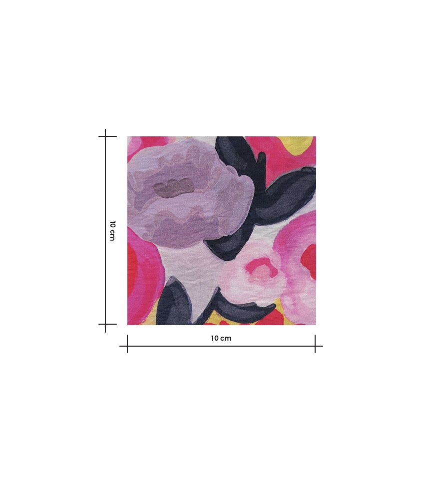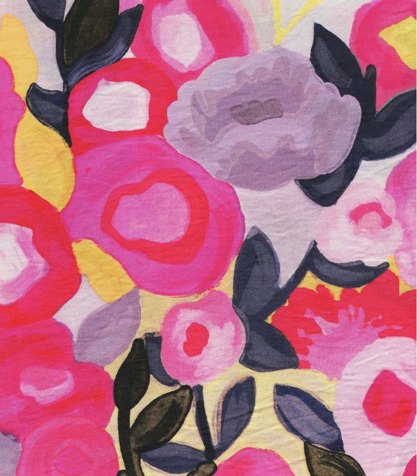 Un motif floral libre et expressif, comme peint à l’aquarelle, où se mêlent des touches de rose fuchsia, de parme délicat et jaune lumineux. Une composition joyeuse et spontanée qui évoque un jardin ensoleillé, vibrant de couleurs et de vie.