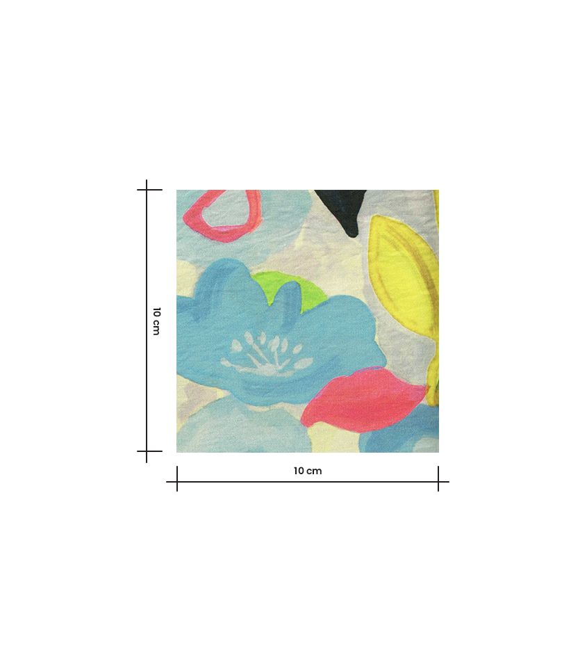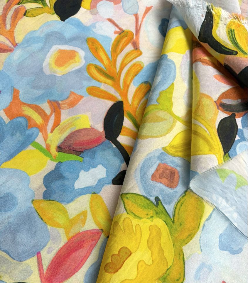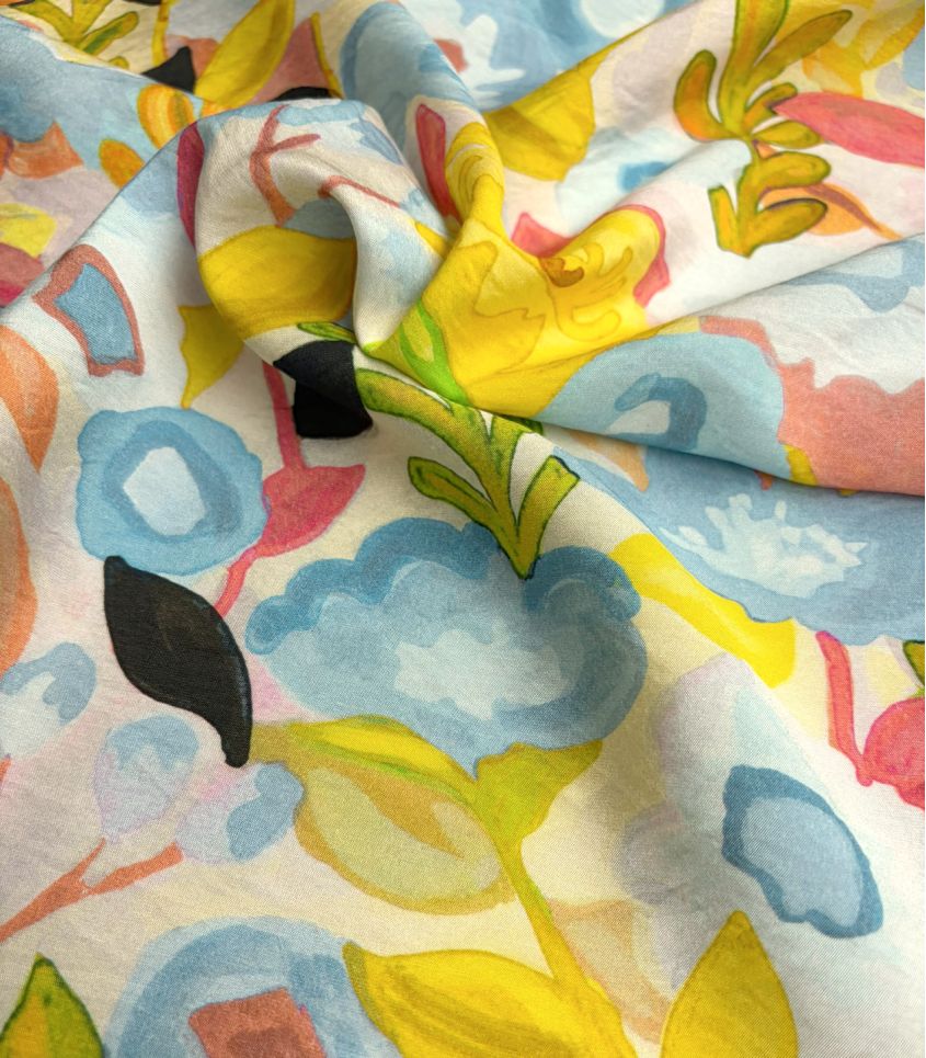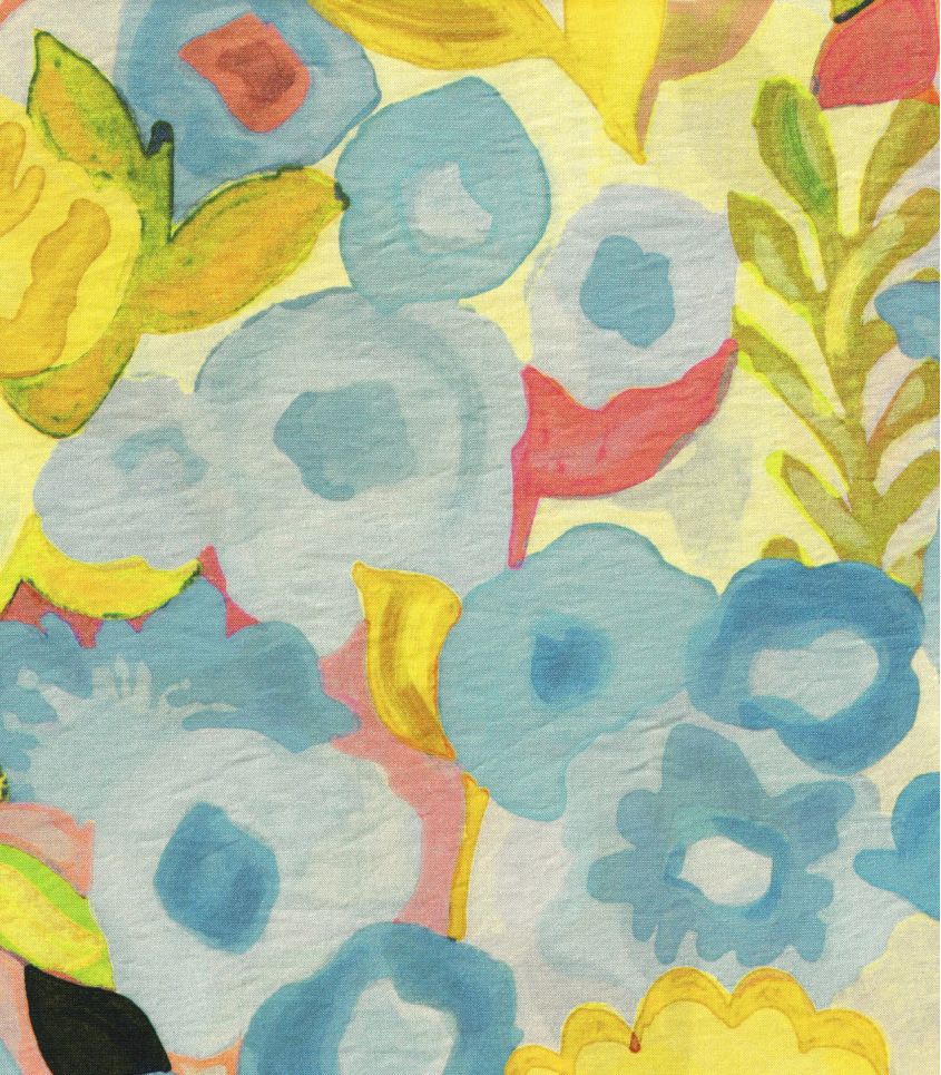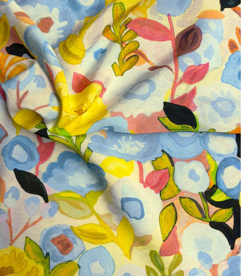 Un motif floral libre et expressif, comme peint à l’aquarelle, où se mêlent des touches de bleu, de jaune lumineux et de rose délicat. Une composition joyeuse et spontanée qui évoque un jardin ensoleillé, vibrant de couleurs et de vie.