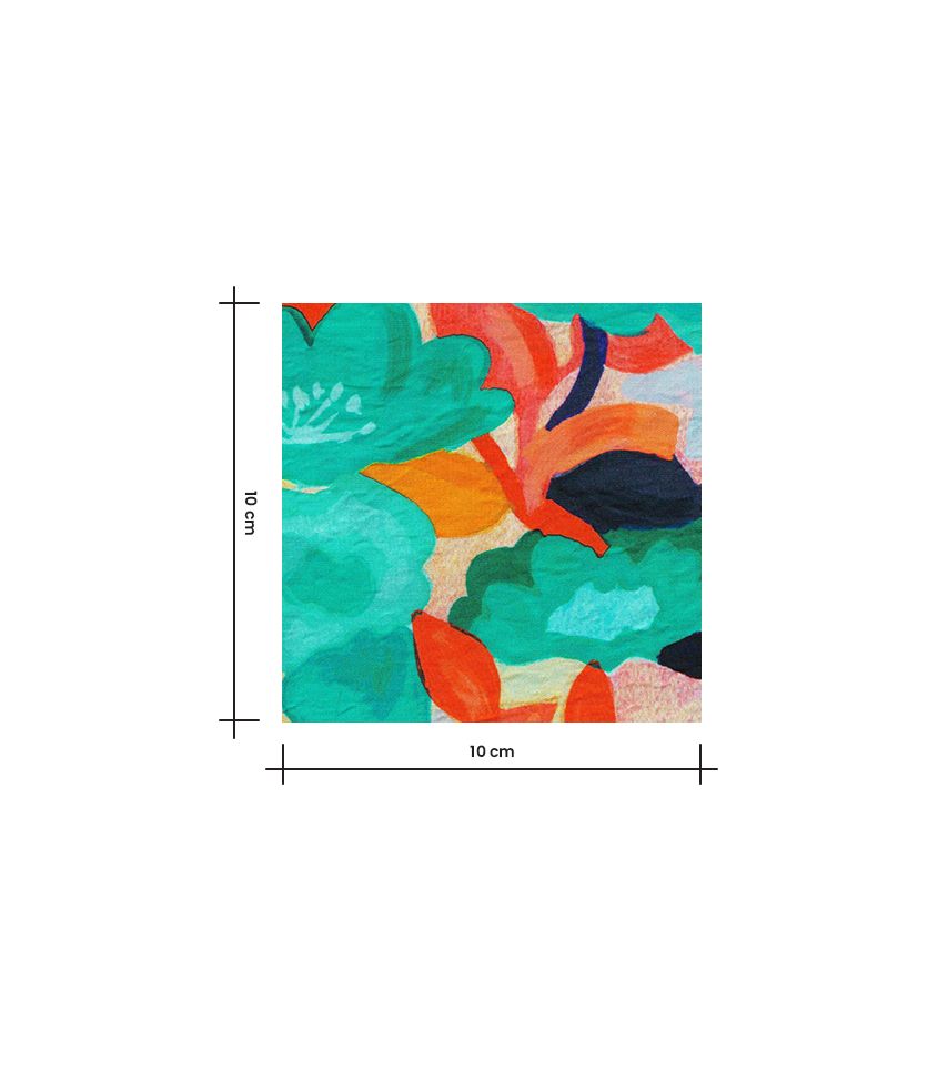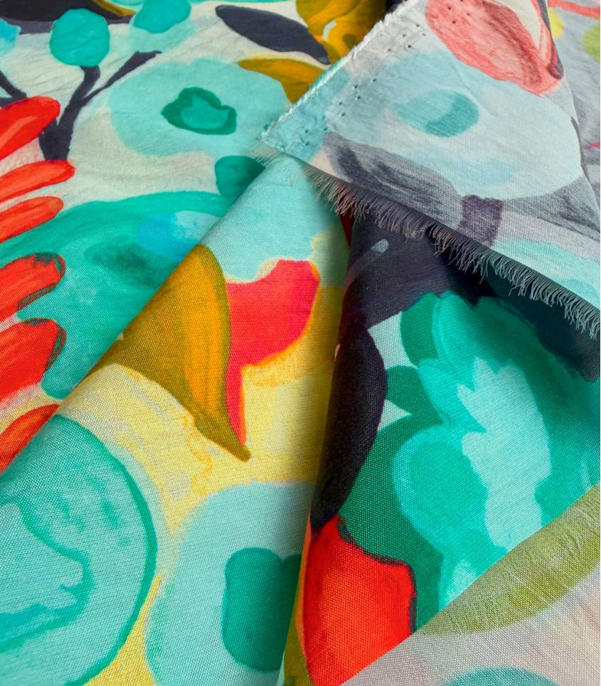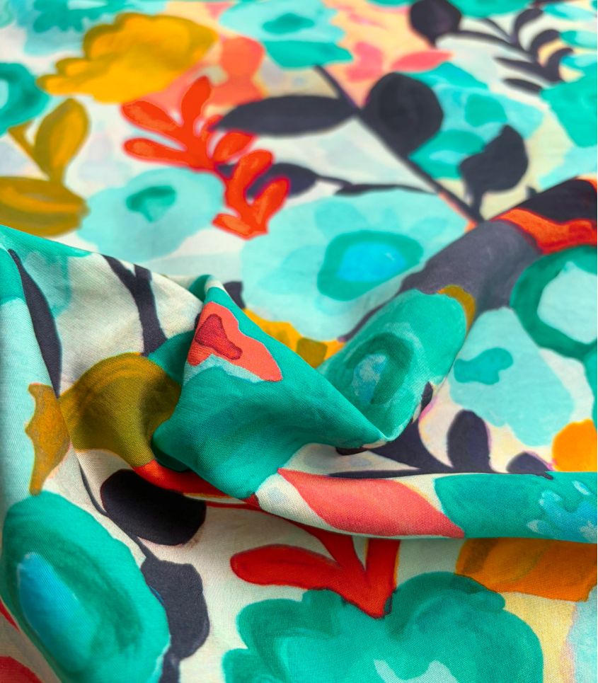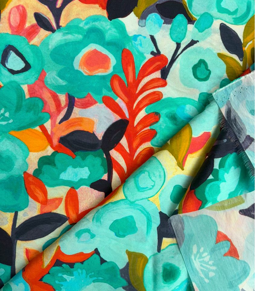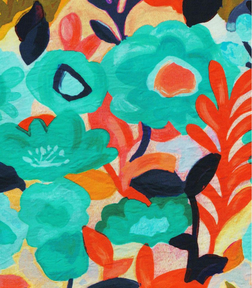 Un motif floral libre et expressif, comme peint à l’aquarelle, où se mêlent des touches de bleu turquoise, de jaune lumineux et d'orange. Une composition joyeuse et spontanée qui évoque un jardin ensoleillé, vibrant de couleurs et de vie.